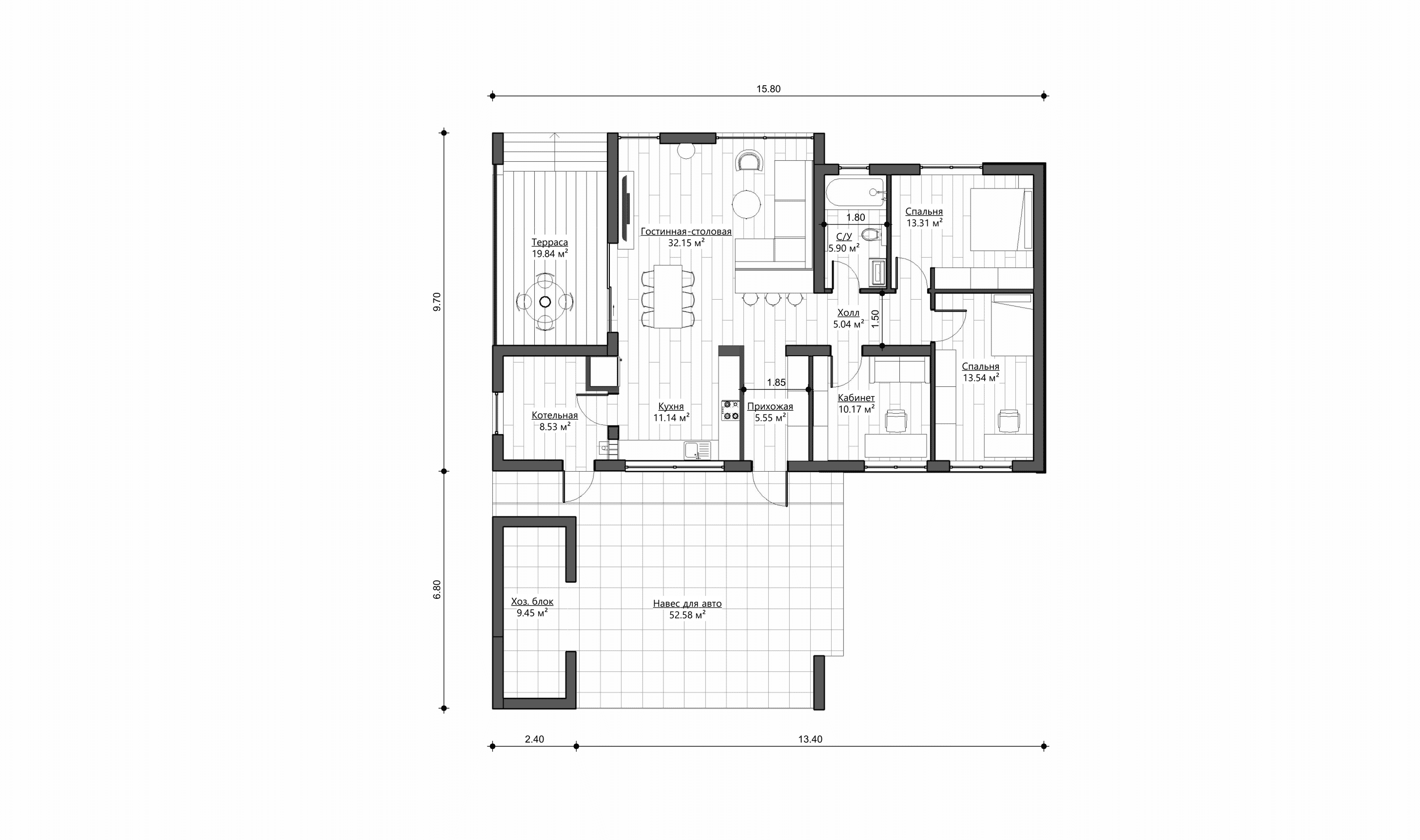 Вся инженерная инфраструктура сосредоточена в котельной, что обеспечивает простоту эксплуатации. Проект также предлагает зеркальный вариант планировки, позволяющий адаптировать дом под любой участок и его ориентацию относительно сторон света.