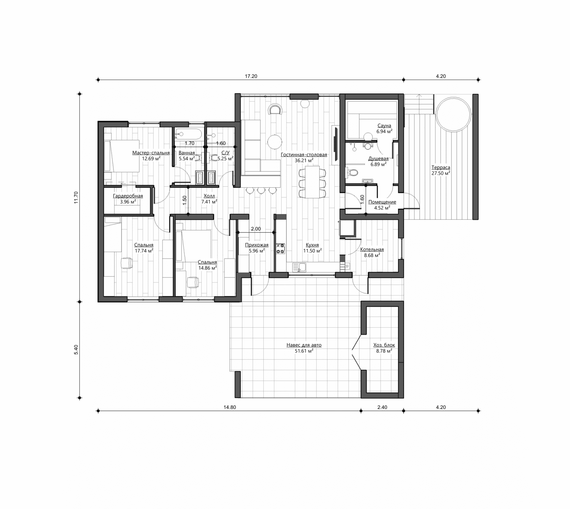 Вся инженерная инфраструктура сосредоточена в котельной, что обеспечивает простоту эксплуатации. Проект также предлагает зеркальный вариант планировки, позволяющий адаптировать дом под любой участок и его ориентацию относительно сторон света.