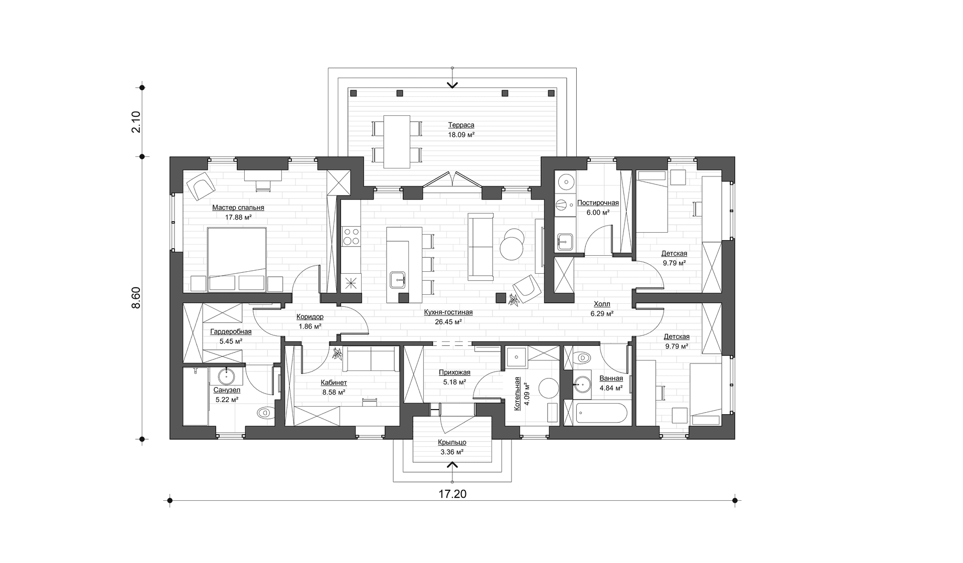 Дом идеально подходит для семьи с детьми. Для родителей, которые «за» сепарирование и взросление наших детей. Именно поэтому мы разделили родительский много—функциональный блок с кабинетом, гардеробной, душевой (с возможностью установить хамам) от активного, яркого и самое главное самостоятельного детского блока. Мы сохранили сердце дома — общую зону приема пищи и досуга с камином, винилом, кинопрокатами и выходом в зону барбекю.