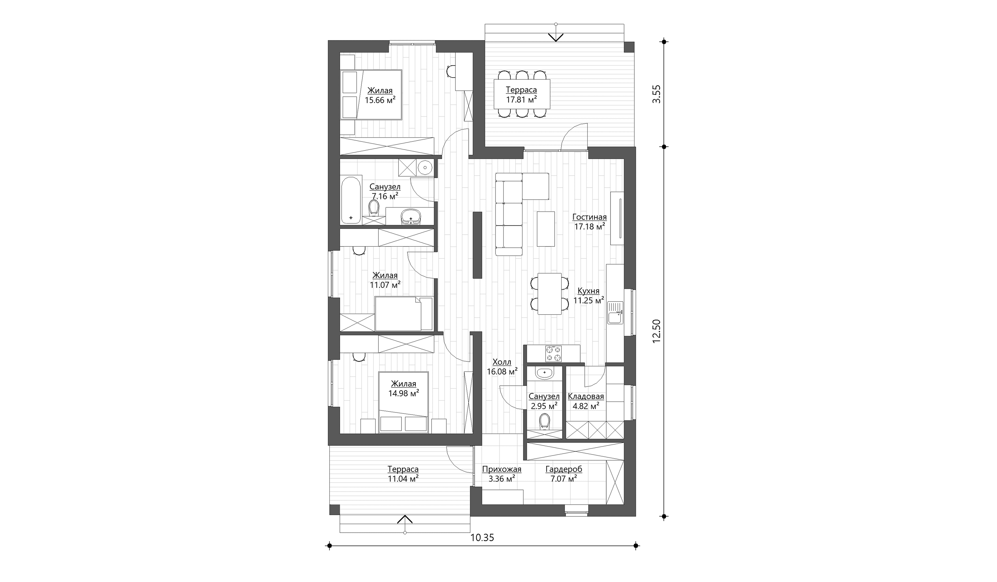 Данная серия проектов предполагает 8 планировочных решений от 63 до 134 м2 внутренней (отапливаемой) площади. Кухня-гостиная объединены в одно общее пространство, откуда можно выйти на просторную террасу.