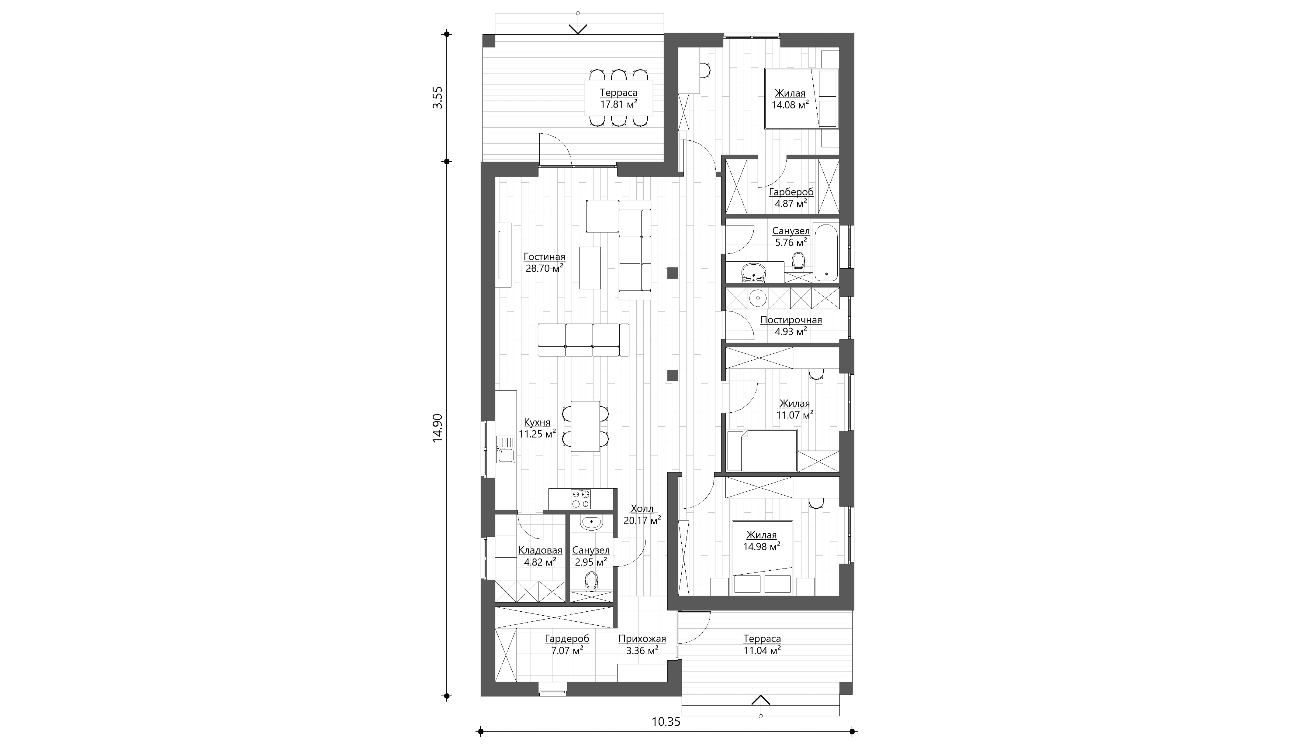 Данная серия проектов предполагает 8 планировочных решений от 63 до 134 м2 внутренней (отапливаемой) площади. Кухня-гостиная объединены в одно общее пространство, откуда можно выйти на просторную террасу.
