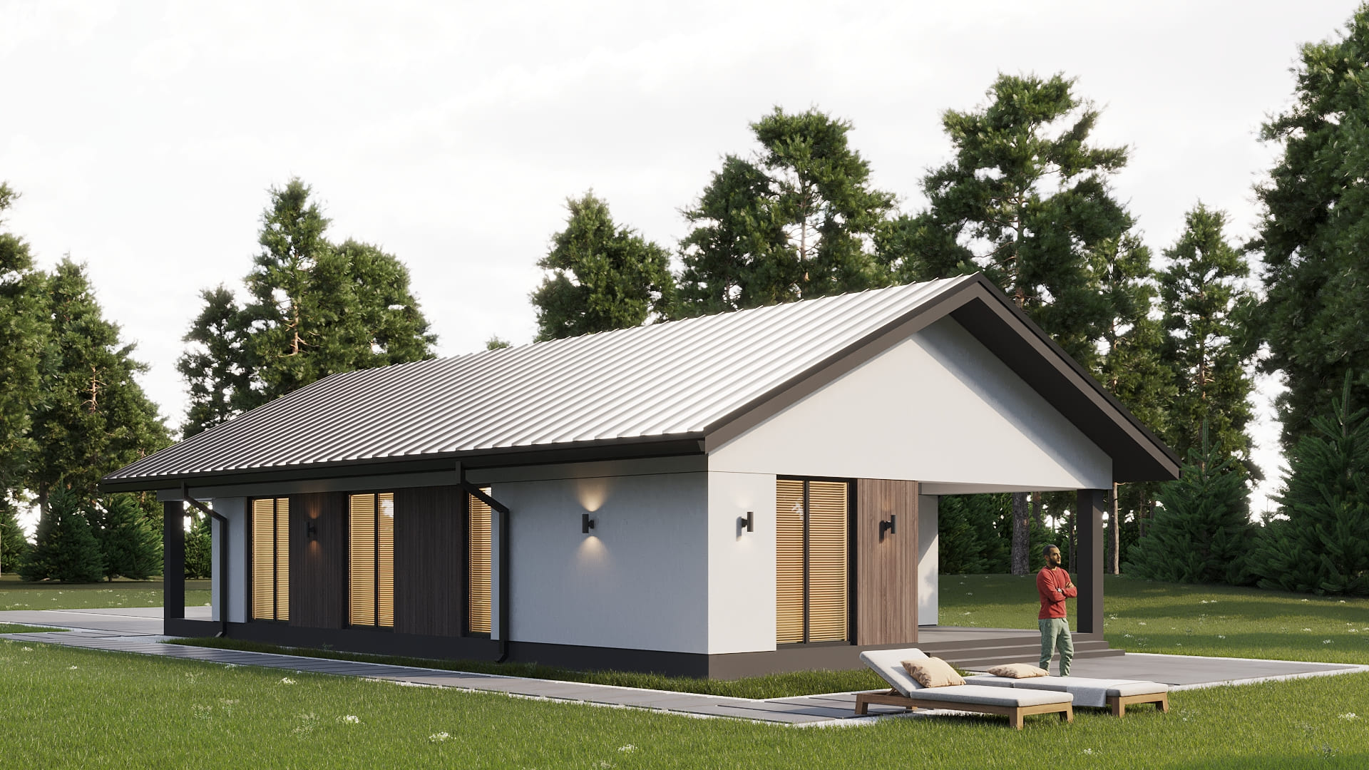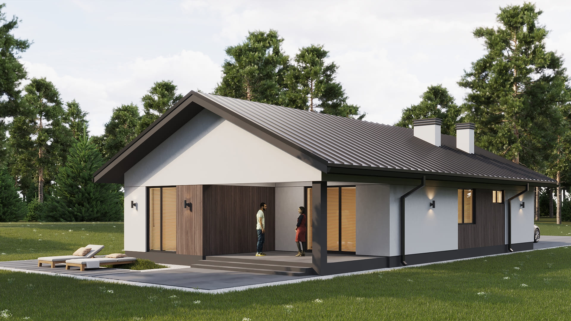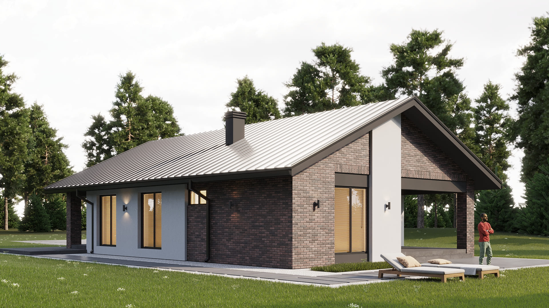 Уютный одноэтажный дом с классической и в тоже время простой двускатной кровлей. Имеет четкое и продуманное зонирование на общую (гостевую) и хозяйскую (спальную) зоны. Отлично подойдет для комфортного проживания и отдыха семьи из 3-5 человек.