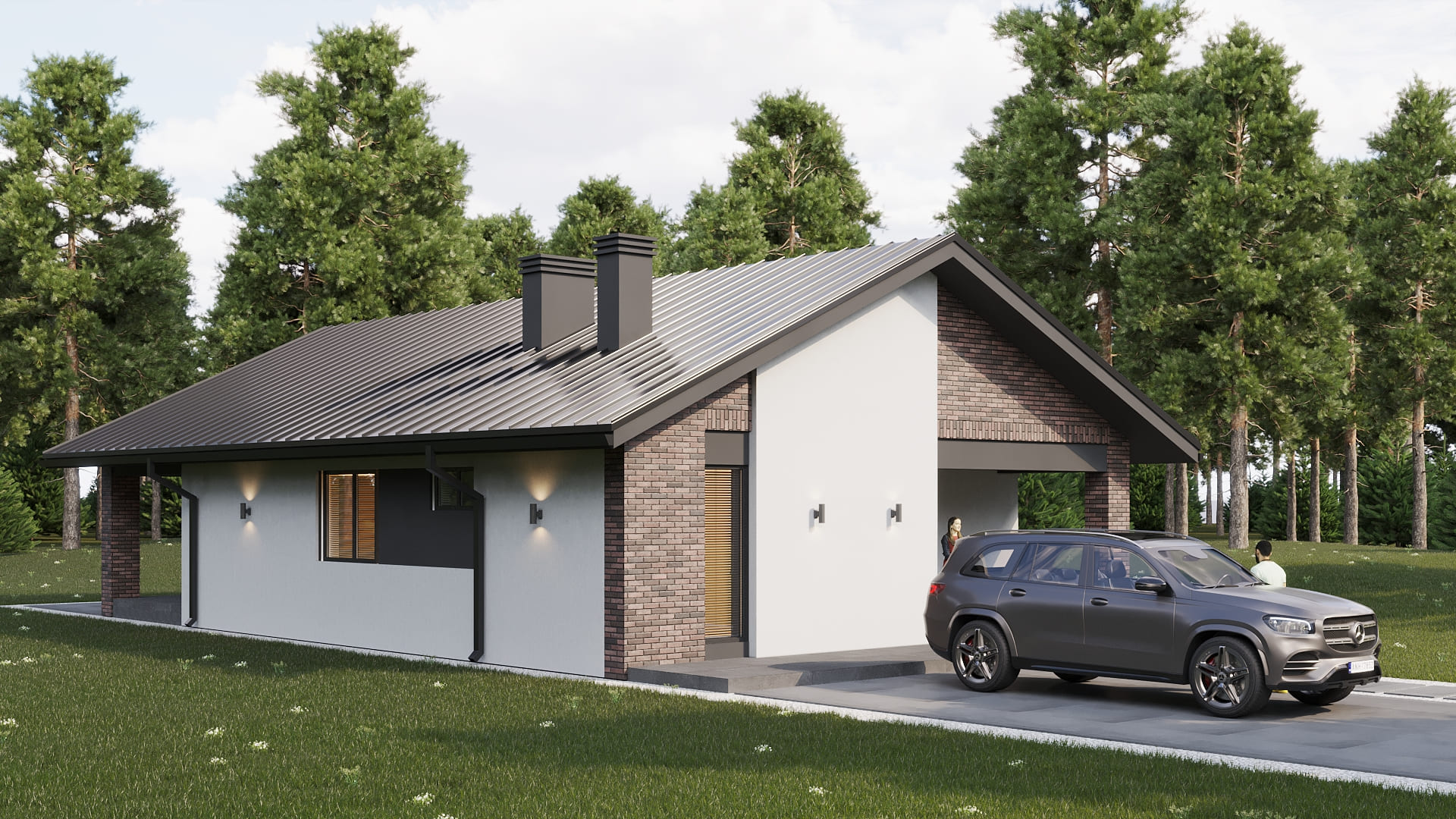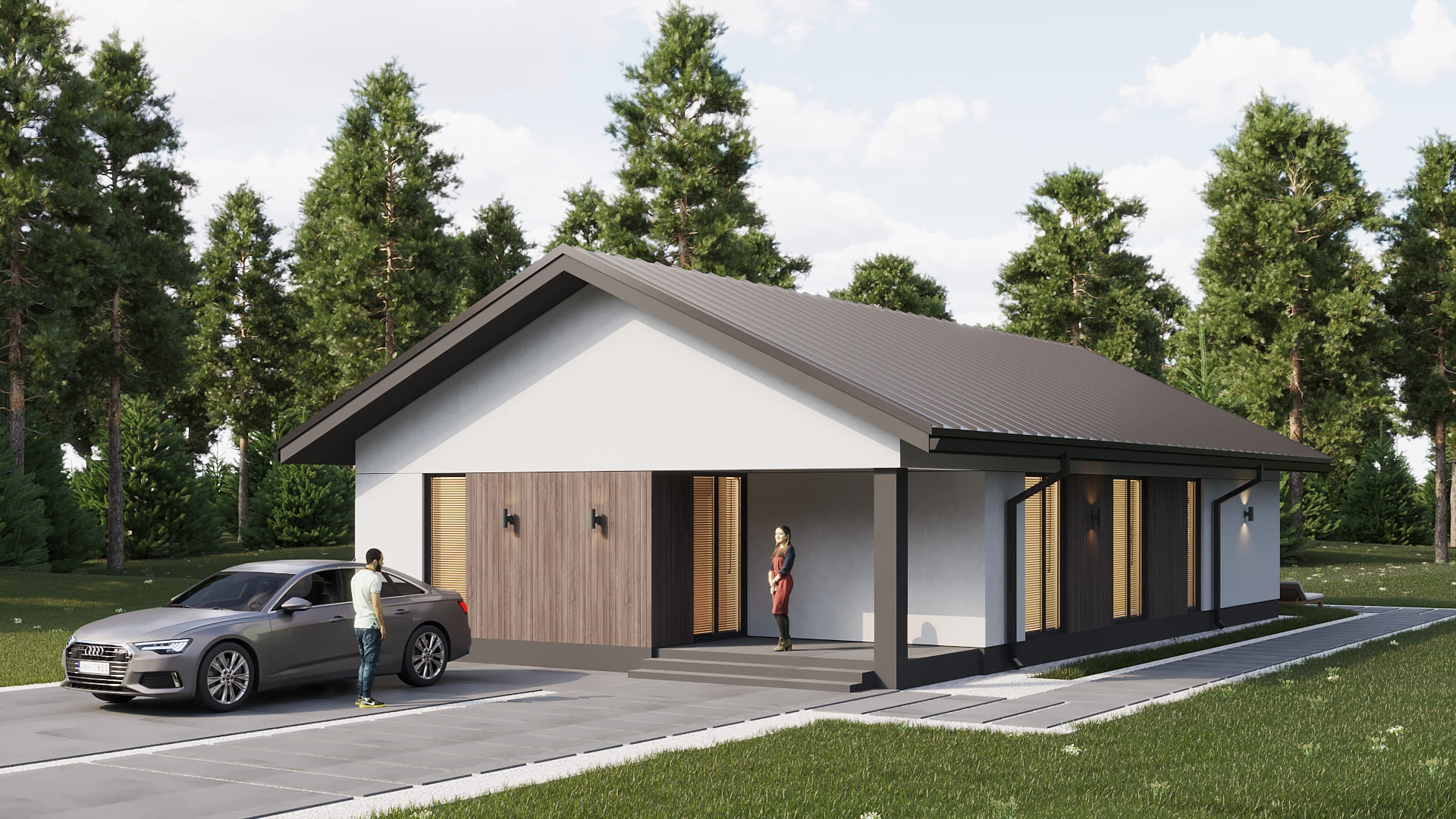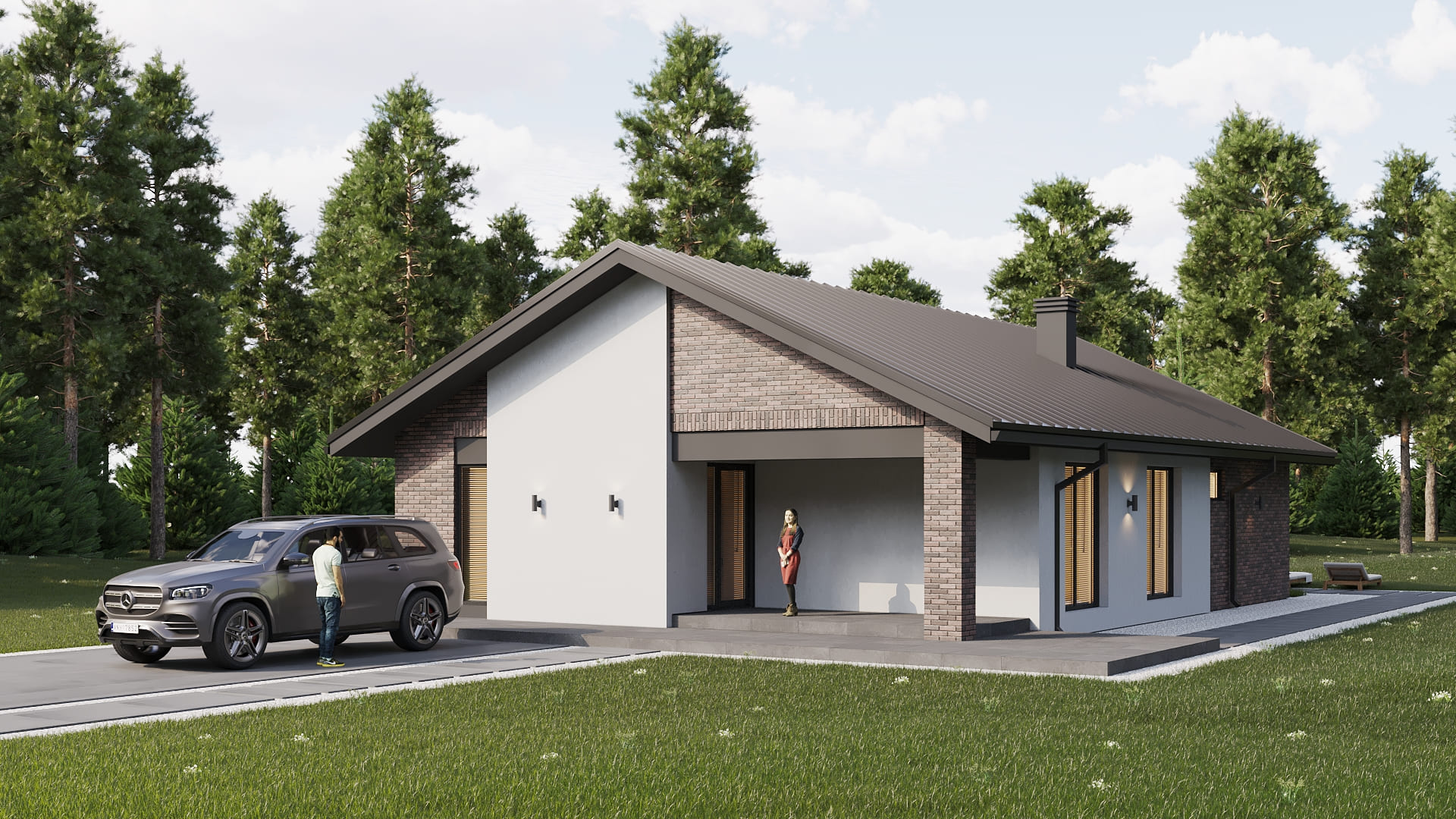 Уютный одноэтажный дом с классической и в тоже время простой двускатной кровлей. Имеет четкое и продуманное зонирование на общую (гостевую) и хозяйскую (спальную) зоны. Отлично подойдет для комфортного проживания и отдыха семьи из 3-5 человек.