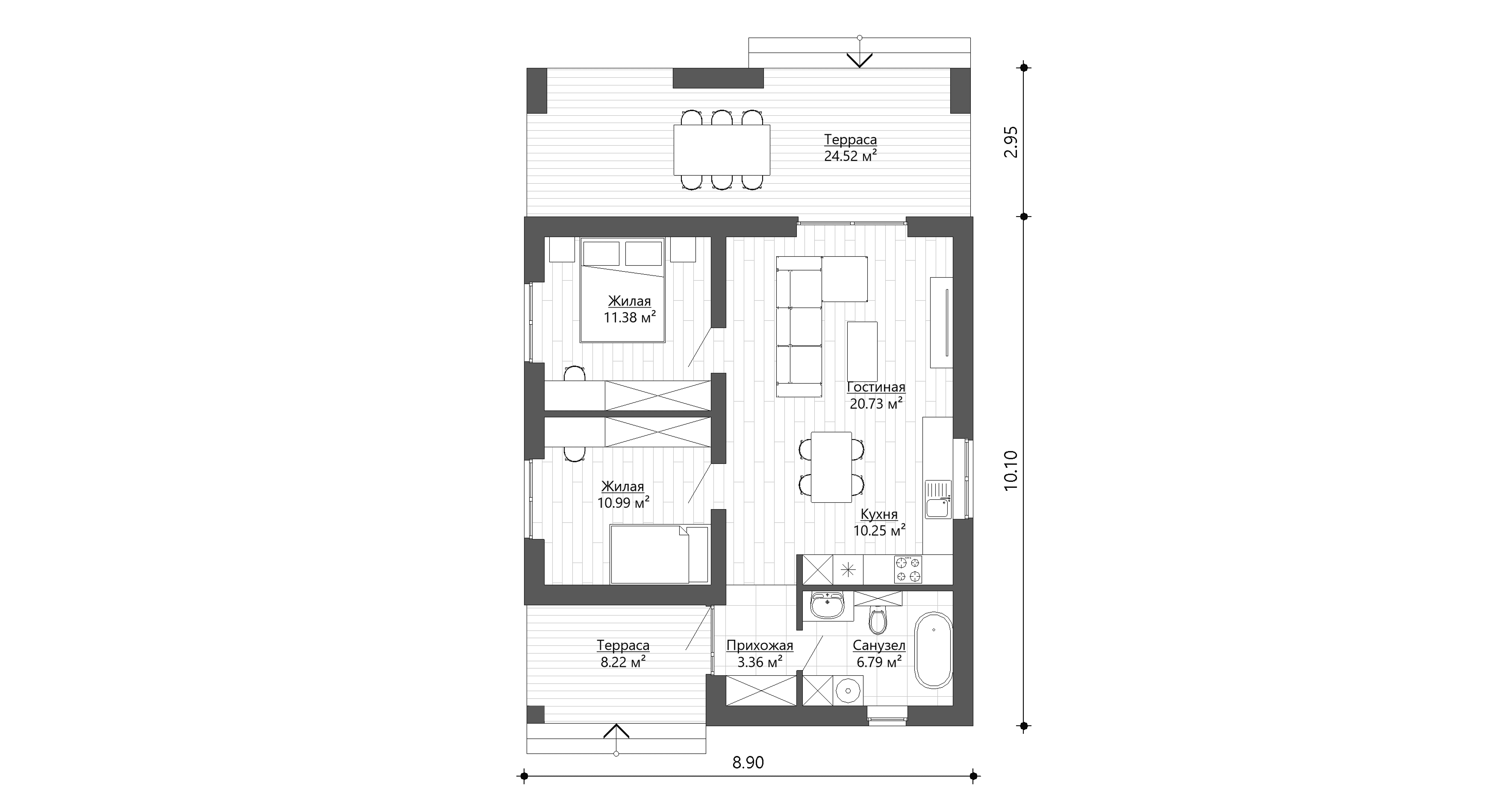 Данная серия проектов предполагает 8 планировочных решений от 63 до 134 м2 внутренней (отапливаемой) площади. Кухня-гостиная объединены в одно общее пространство, откуда можно выйти на просторную террасу.
