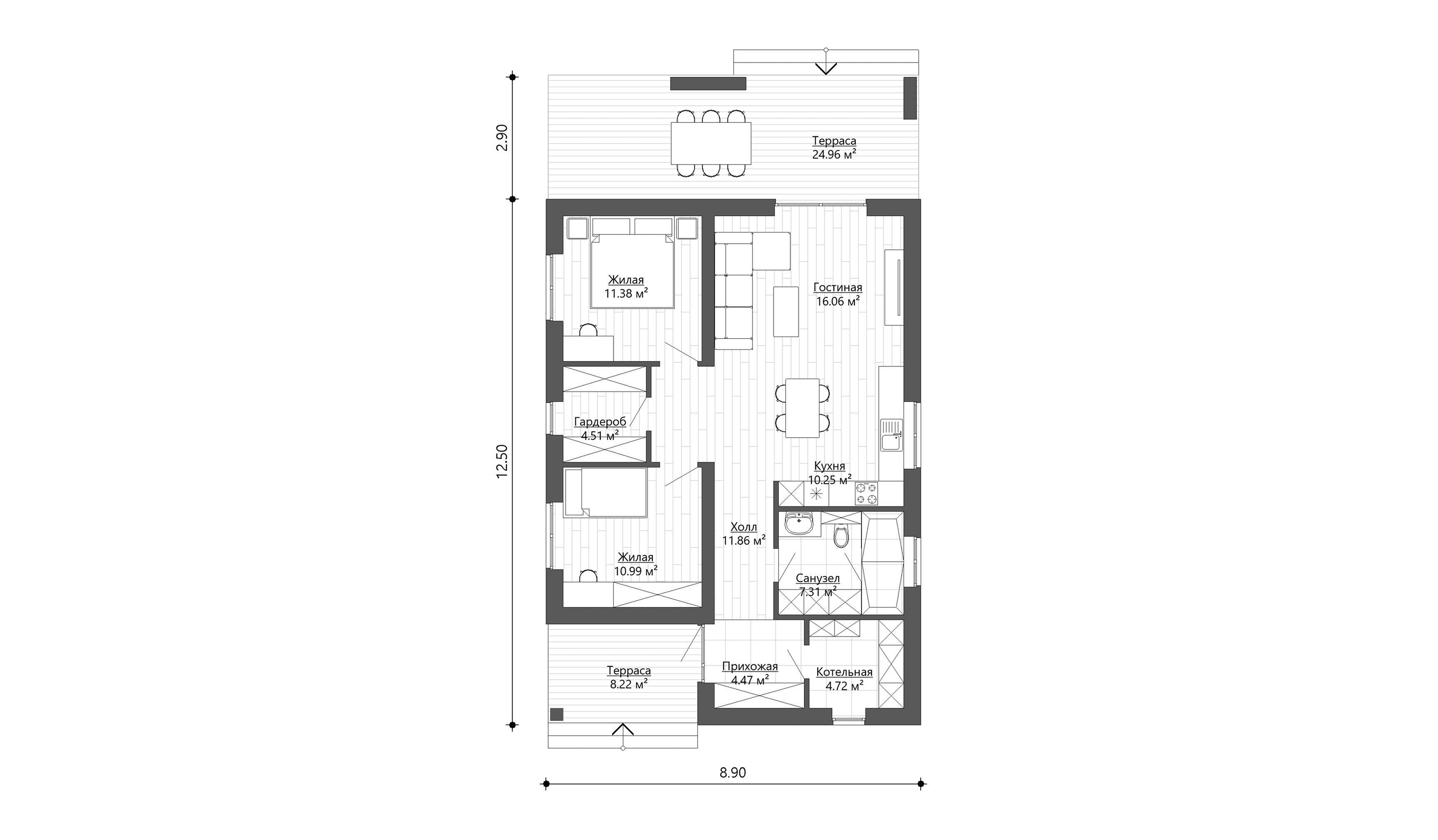 Данная серия проектов предполагает 8 планировочных решений от 63 до 134 м2 внутренней (отапливаемой) площади. Кухня-гостиная объединены в одно общее пространство, откуда можно выйти на просторную террасу.
