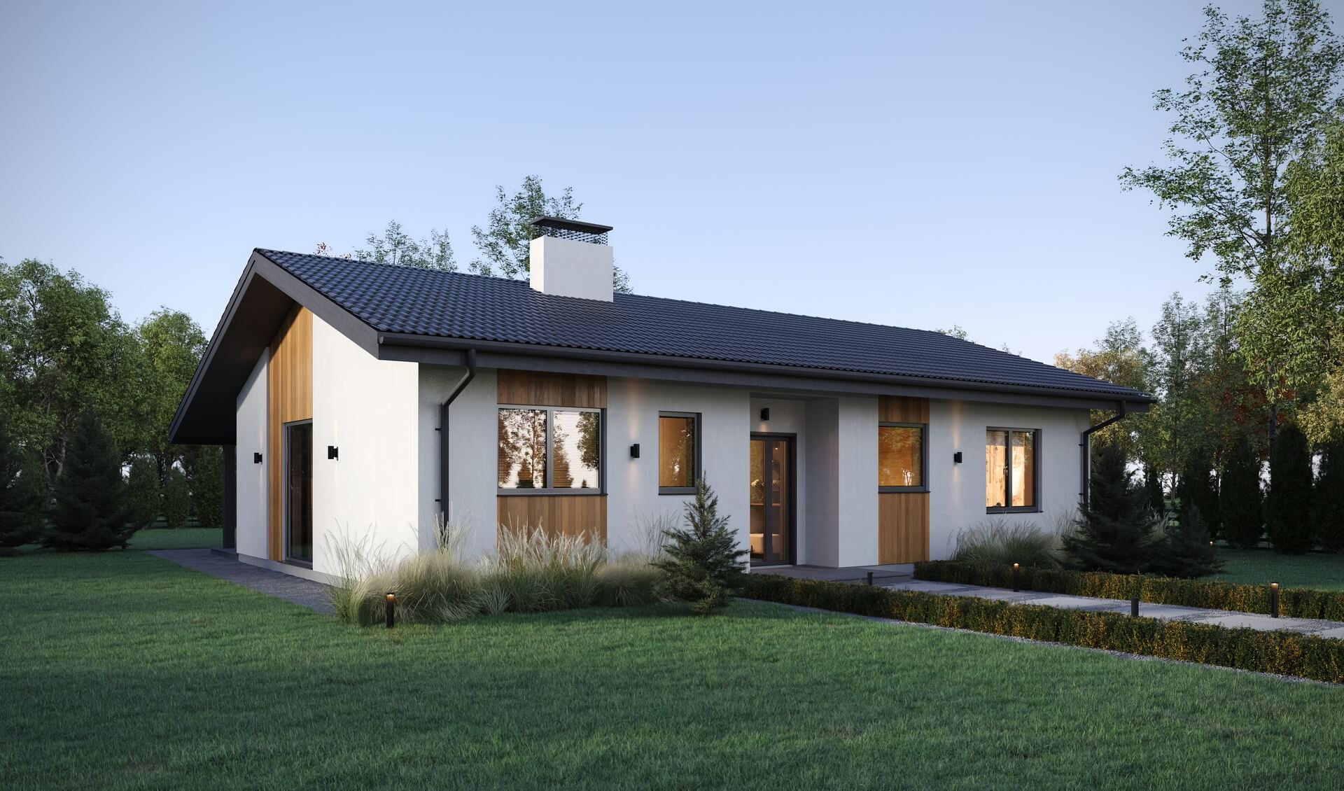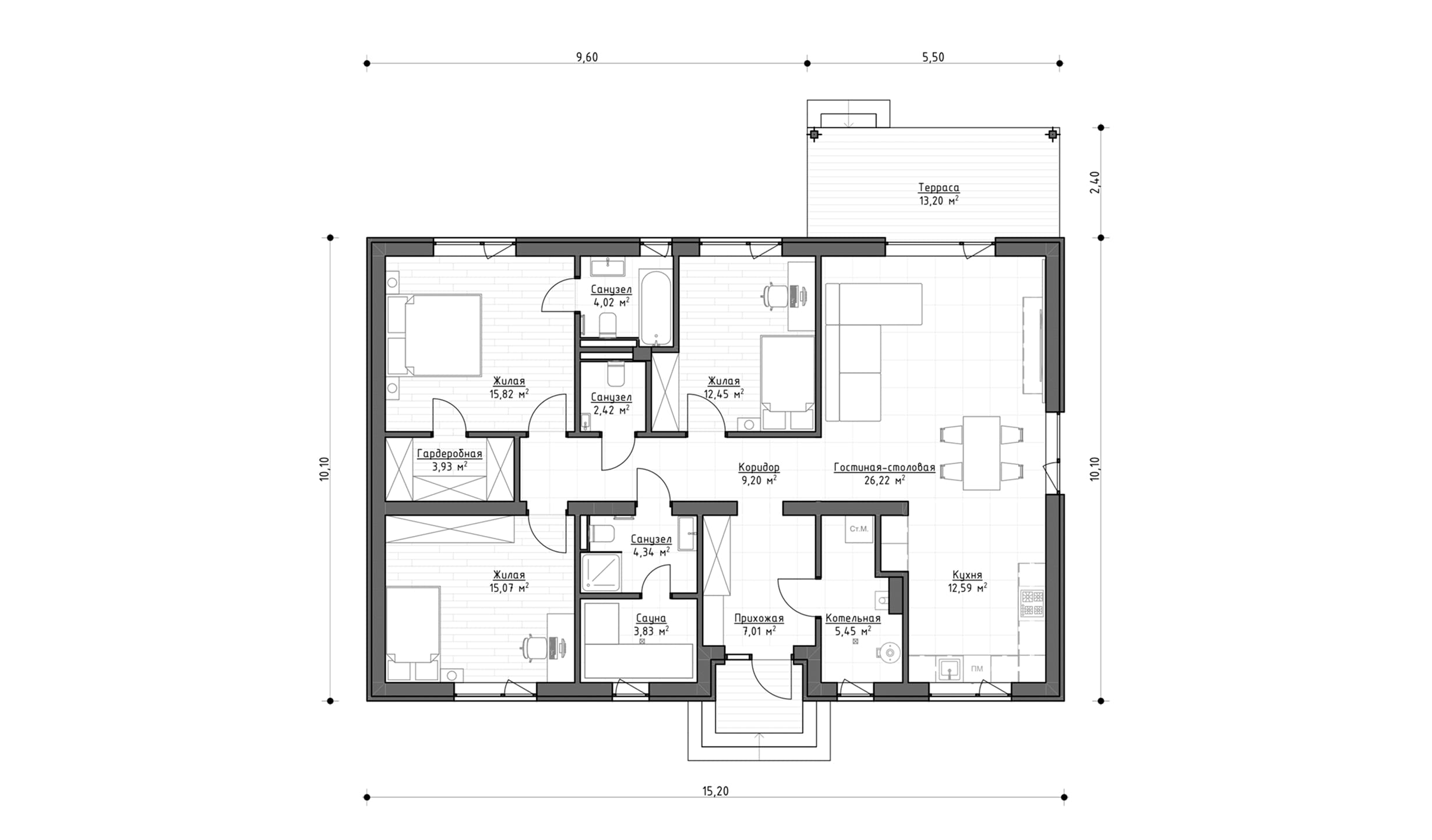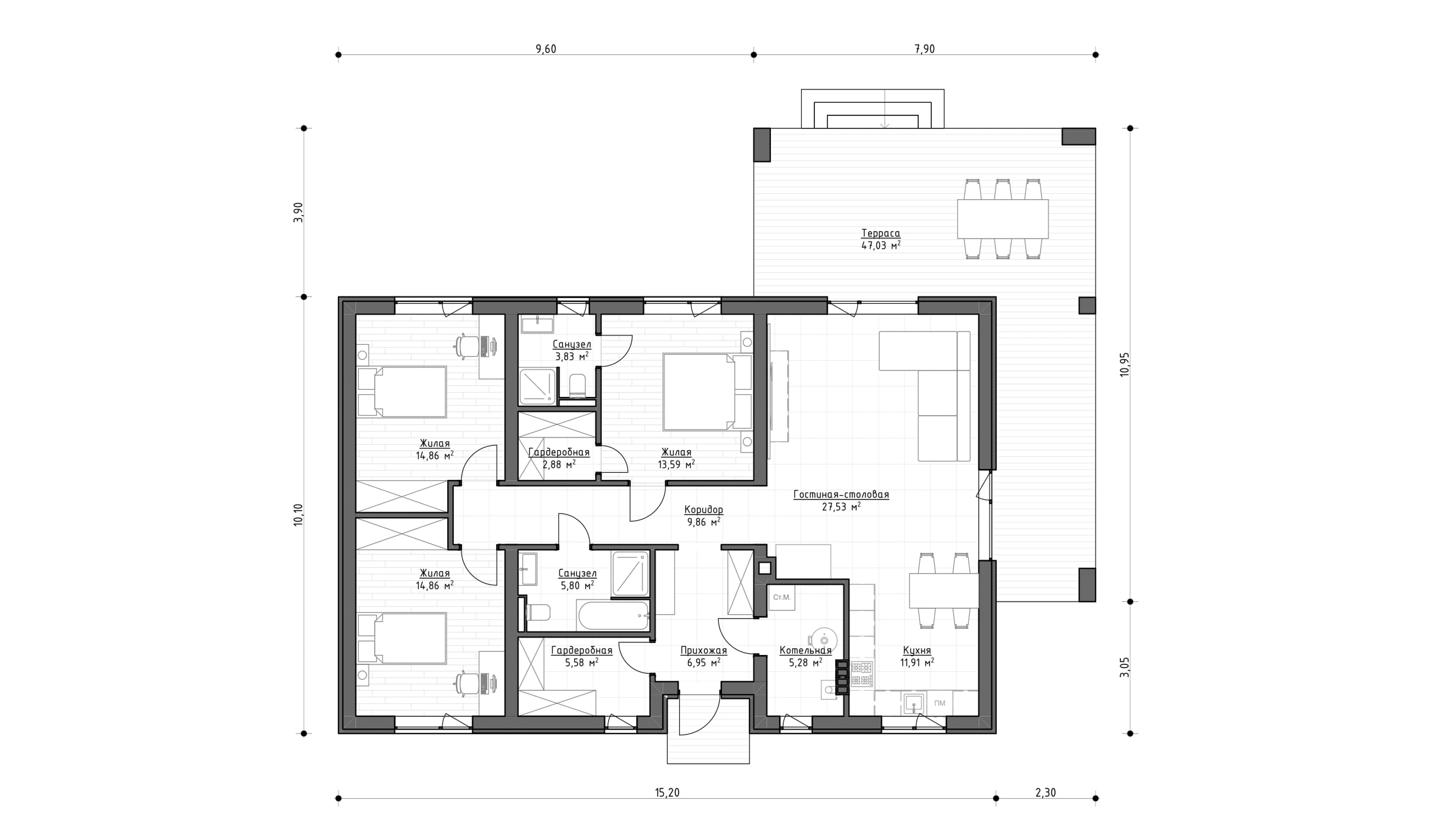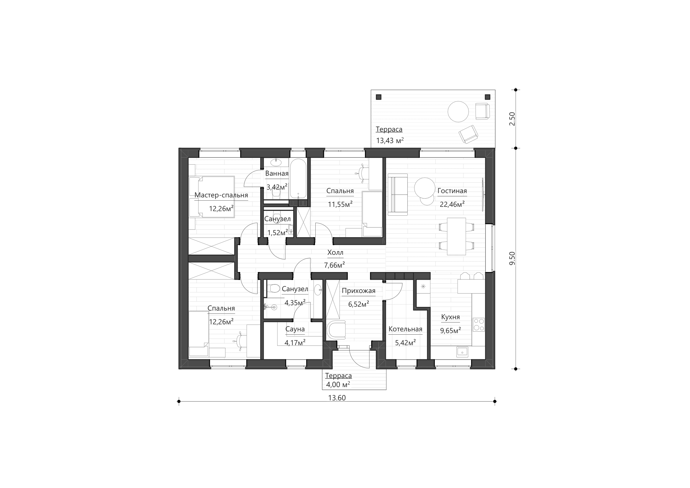 Дом разделен на две функциональные зоны: с левой стороны от входа находится просторная кухня-гостиная с выходом на террасу, справа - спальни, в которых предусмотрены места для работы и учебы, а также встроенные шкафы для хранения вещей.