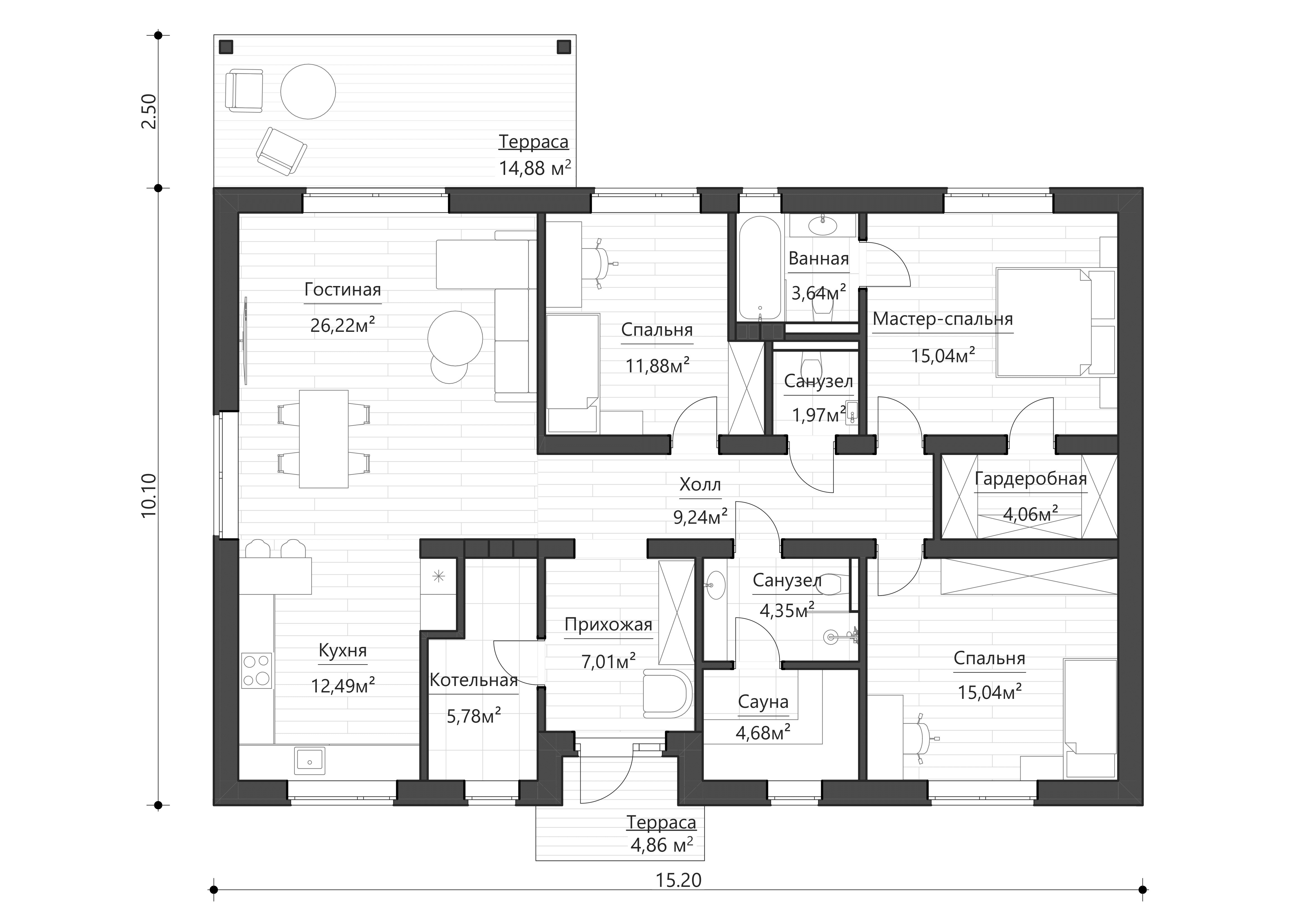 Просторная кухня-гостиная с возможностью предусмотреть камин и крытая терраса позволит провести множество прекрасных вечеров в компании близких вам людей.