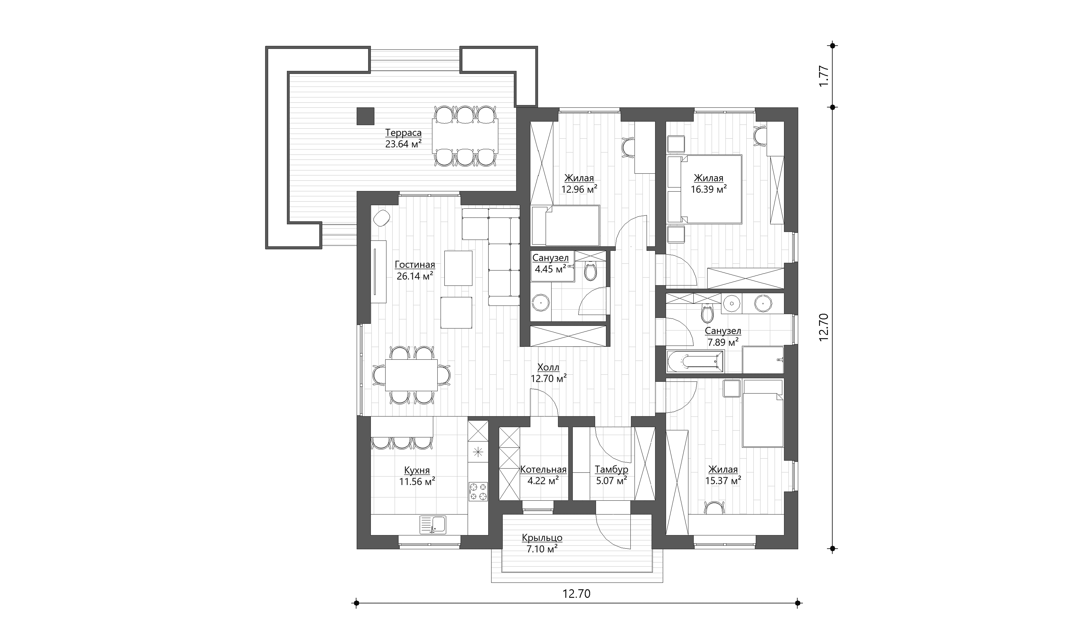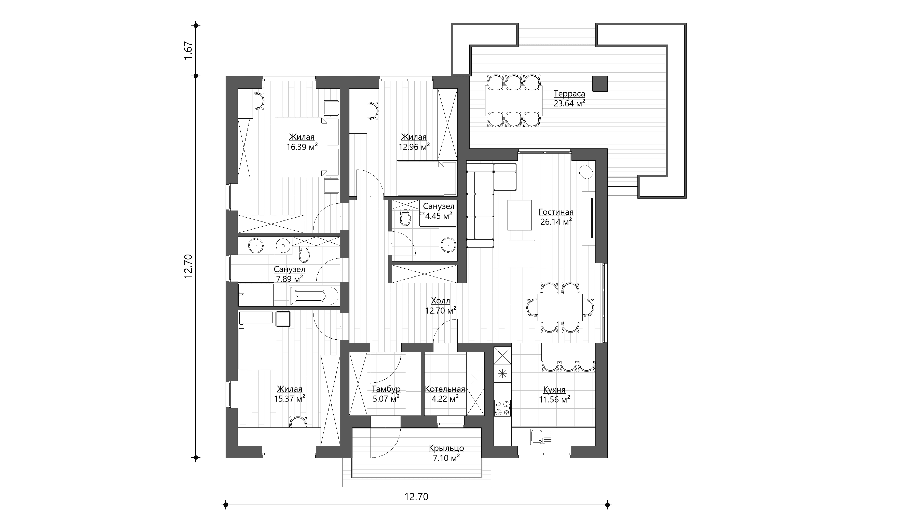 Помещения разделены на общественную и спальную зоны. Входная часть заглублена в дом, что позволяет общей кровлей защитить крыльцо от осадков не делая дополнительного навеса. Из гостиной предусмотрен выход на просторную террасу. Проект имеет зеркальный вариант планировки что позволяет разместить его на участке с любой ориентацией по сторонам света.