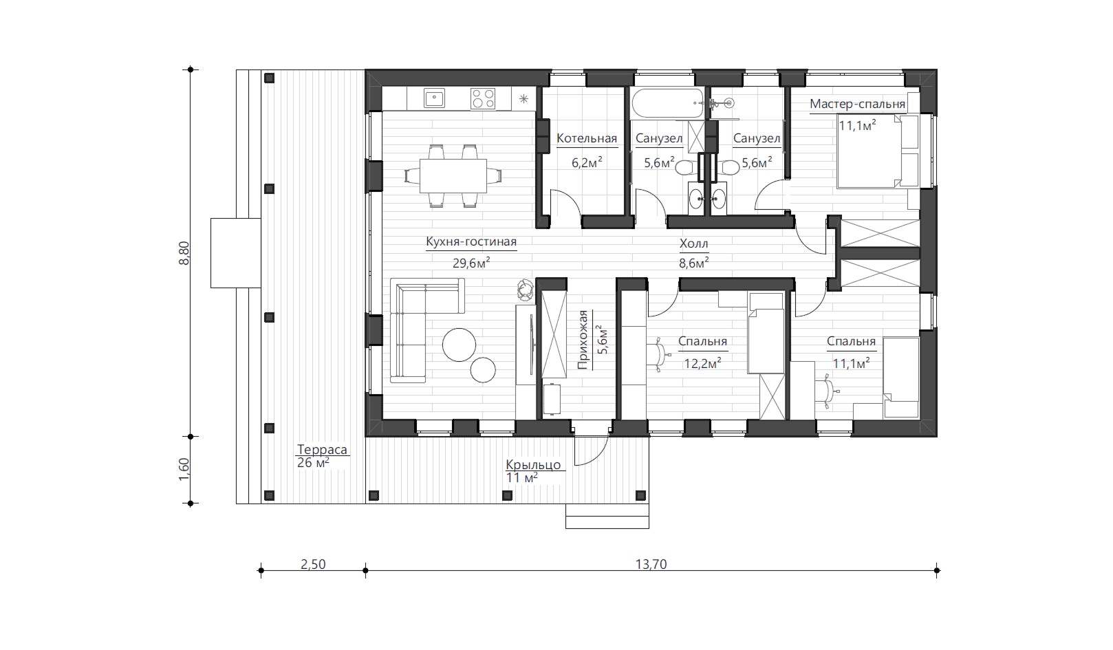 Дом разделен на две функциональные зоны: с левой стороны от входа находится просторная кухня-гостиная с выходом на террасу, справа - спальни, в которых предусмотрены места для работы и учебы, а также встроенные шкафы для хранения вещей. В доме располагается мини-гардеробная, несколько санузлов и котельная с достаточной площадью для расположения всего необходимого оборудования. Просторная кухня-гостиная с возможностью предусмотреть камин и крытая терраса позволит провести множество прекрасных вечеров в компании близких вам людей.