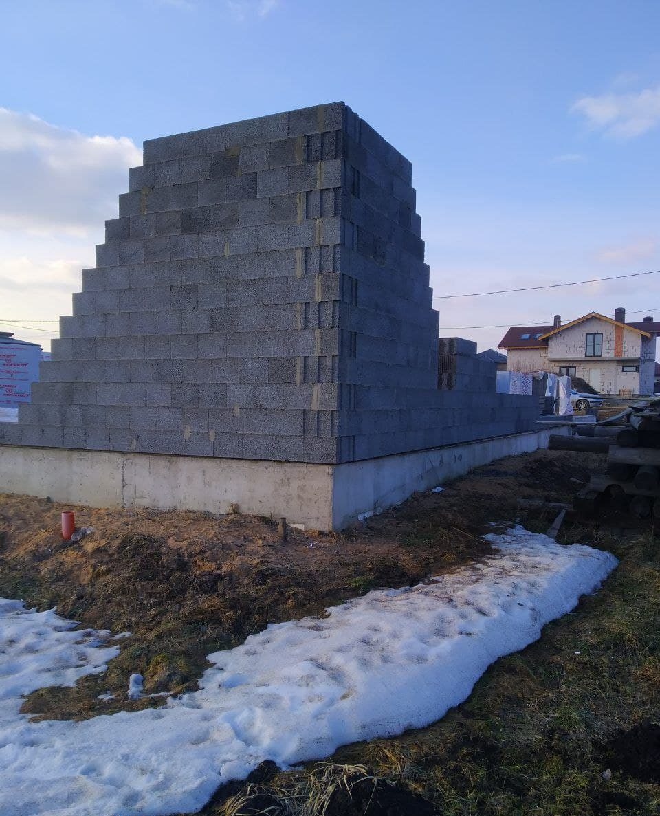 Стены из газобетонных блоков: Наружные – 400 мм. D400. Внутренние несущие – 250 мм. D500. Перегородки – 150 мм. D500. Армирование через каждые три ряда + подоконные зоны. Все бетонные элементы утеплены ЭППС + блок для исключения мостиков холода