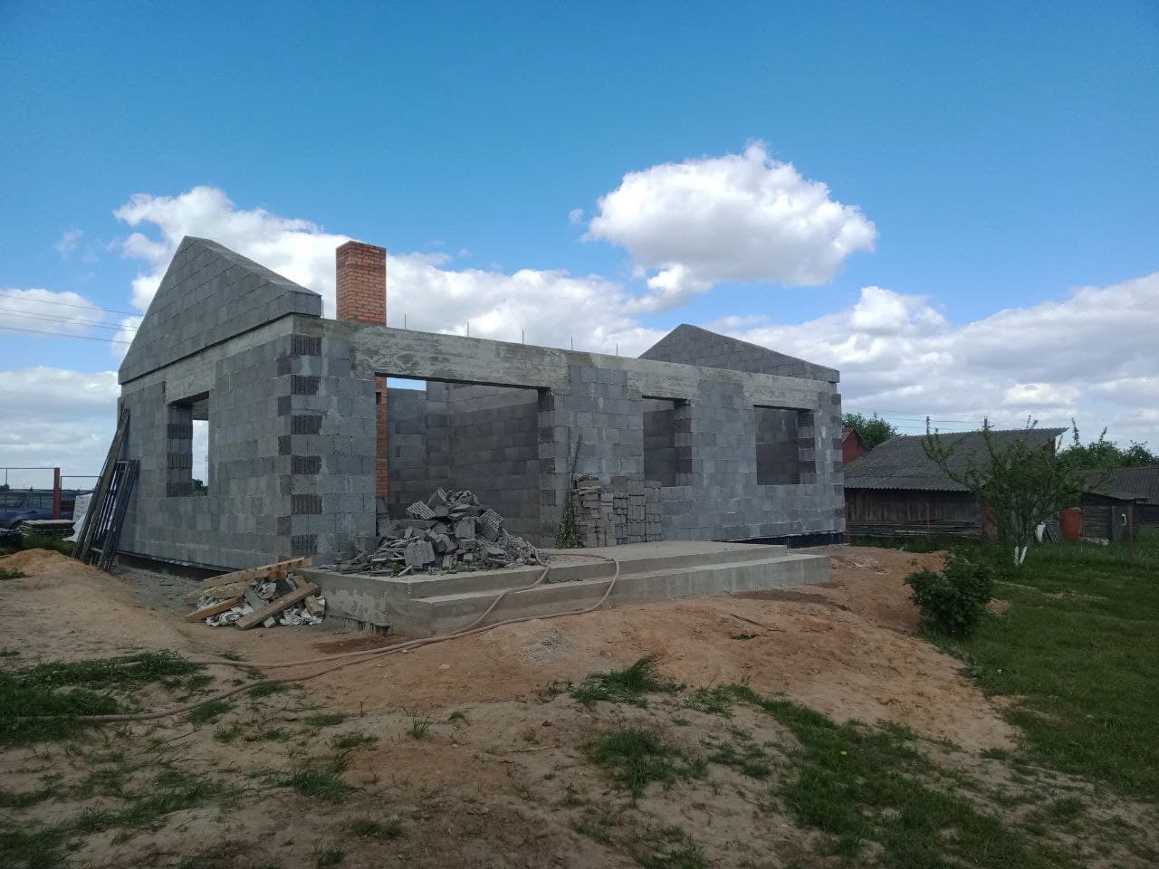 Стены из газобетонных блоков: Наружные – 400 мм. D400. Внутренние несущие – 250 мм. D500. Перегородки – 150 мм. D500. Армирование через каждые три ряда + подоконные зоны. Все бетонные элементы утеплены ЭППС + блок для исключения мостиков холода