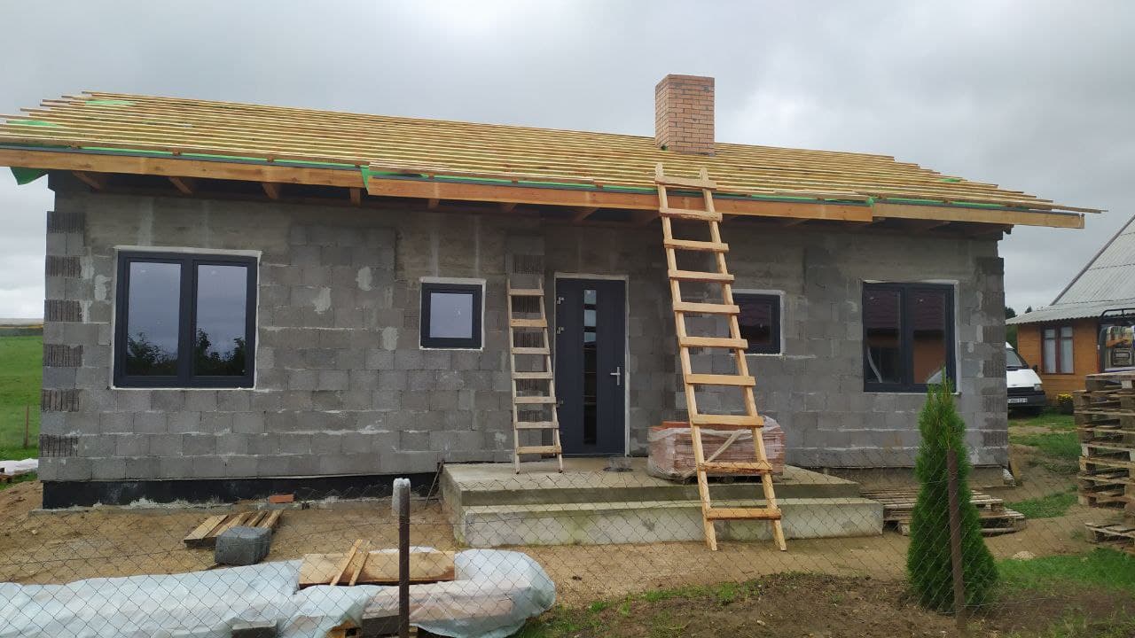 Стропильная система из сухой строганной доски 45х195мм. Кровля - Мягкая черепица по стропильной системе. Так же пирог кровли включает в себя гидроизоляцию из диффузионной мембраны Delta Neo Vent, утепление плитным базальтовым утеплителем Paroc eXtra 250 мм. и пароизоляцию Delta c проклейкой швов специальным скотчем.