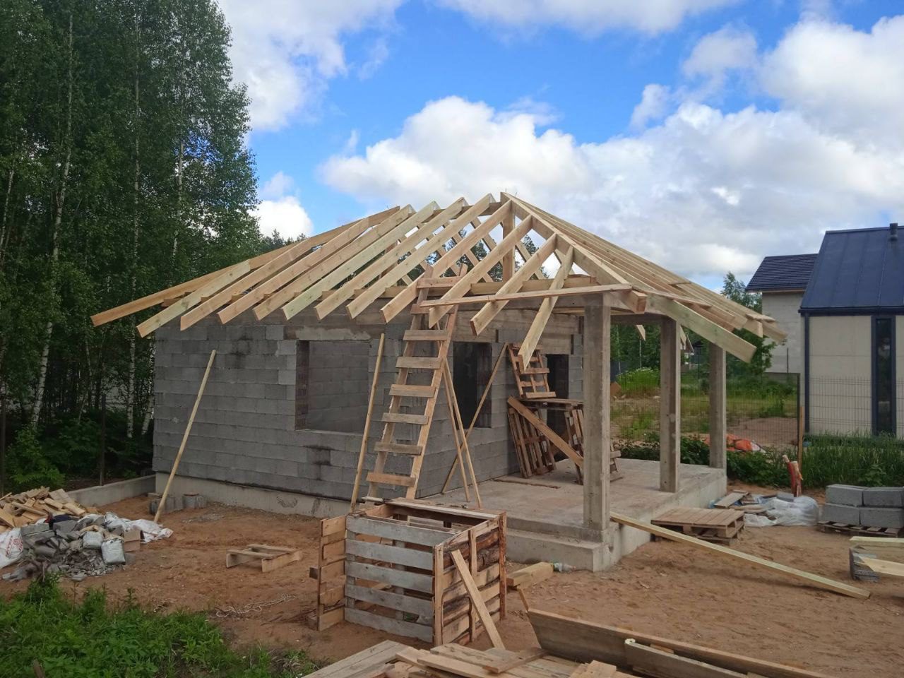 Стропильная система из сухой строганной доски 45х195мм. Кровля - Мягкая черепица по стропильной системе. Так же пирог кровли включает в себя гидроизоляцию из диффузионной мембраны Delta Neo Vent, утепление плитным базальтовым утеплителем Paroc eXtra 250 мм. и пароизоляцию Delta c проклейкой швов специальным скотчем.