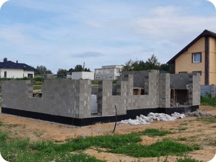 Стены из газобетонных блоков: Наружные – 400 мм. D400. Внутренние несущие – 250 мм. D500. Перегородки – 150 мм. D500. Армирование через каждые три ряда + подоконные зоны. Все бетонные элементы утеплены ЭППС + блок для исключения мостиков холода