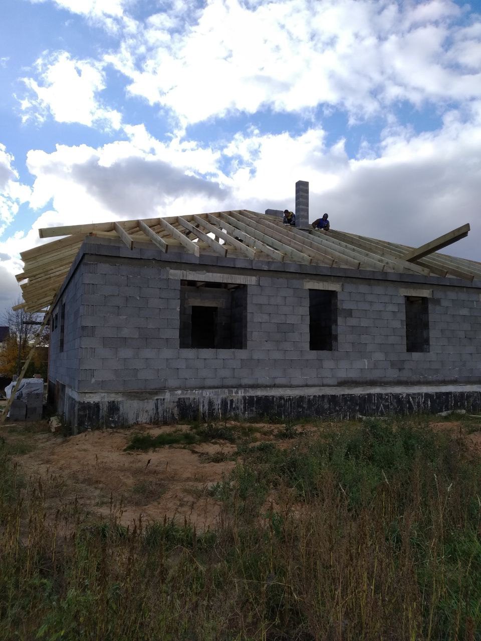 Стропильная система из сухой строганной доски 45х195мм. Кровля - Мягкая черепица по стропильной системе. Так же пирог кровли включает в себя гидроизоляцию из диффузионной мембраны Delta Neo Vent, утепление плитным базальтовым утеплителем Paroc eXtra 250 мм. и пароизоляцию Delta c проклейкой швов специальным скотчем.