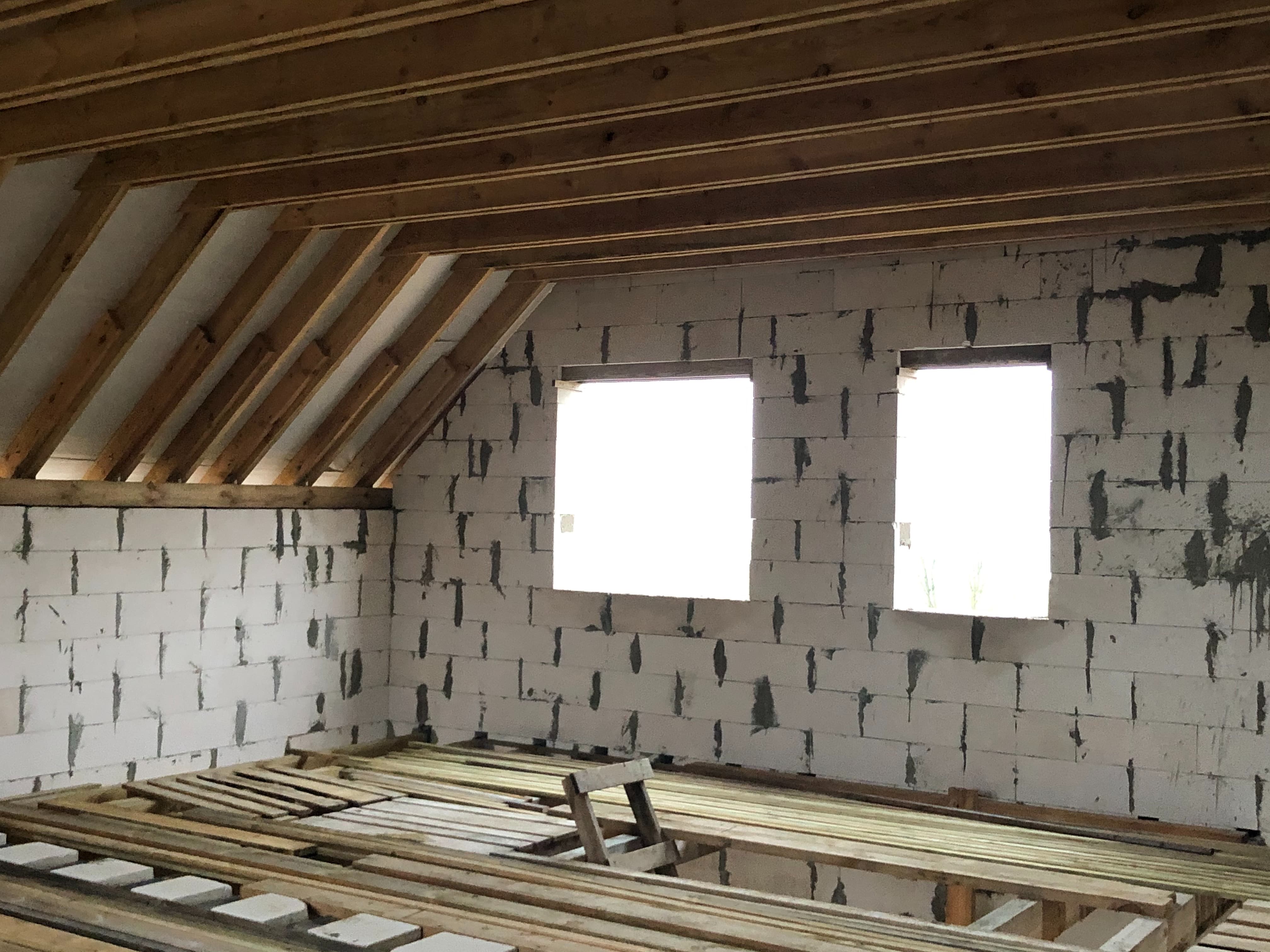 Стены из газобетонных блоков: Наружные – 400 мм. D400. Внутренние несущие – 250 мм. D500. Перегородки – 150 мм. D500. Армирование через каждые три ряда + подоконные зоны. Все бетонные элементы утеплены ЭППС + блок для исключения мостиков холода