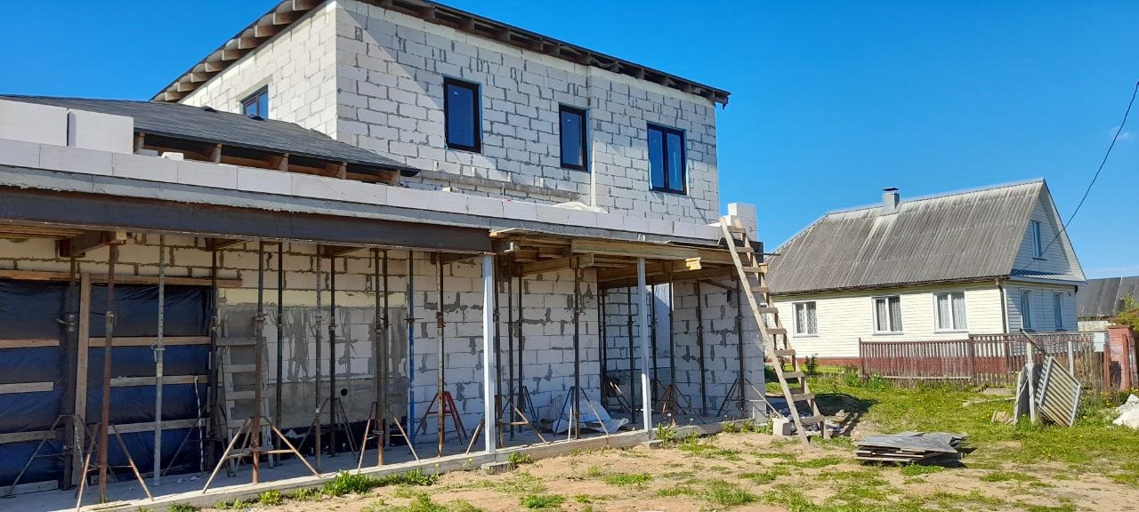 Стены из газобетонных блоков: Наружные – 400 мм. D400. Внутренние несущие – 250 мм. D500. Перегородки – 150 мм. D500. Армирование через каждые три ряда + подоконные зоны. Все бетонные элементы утеплены ЭППС + блок для исключения мостиков холода