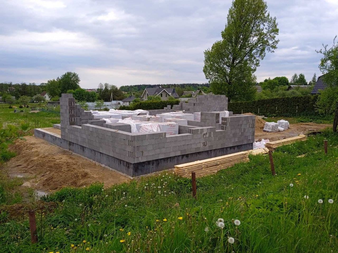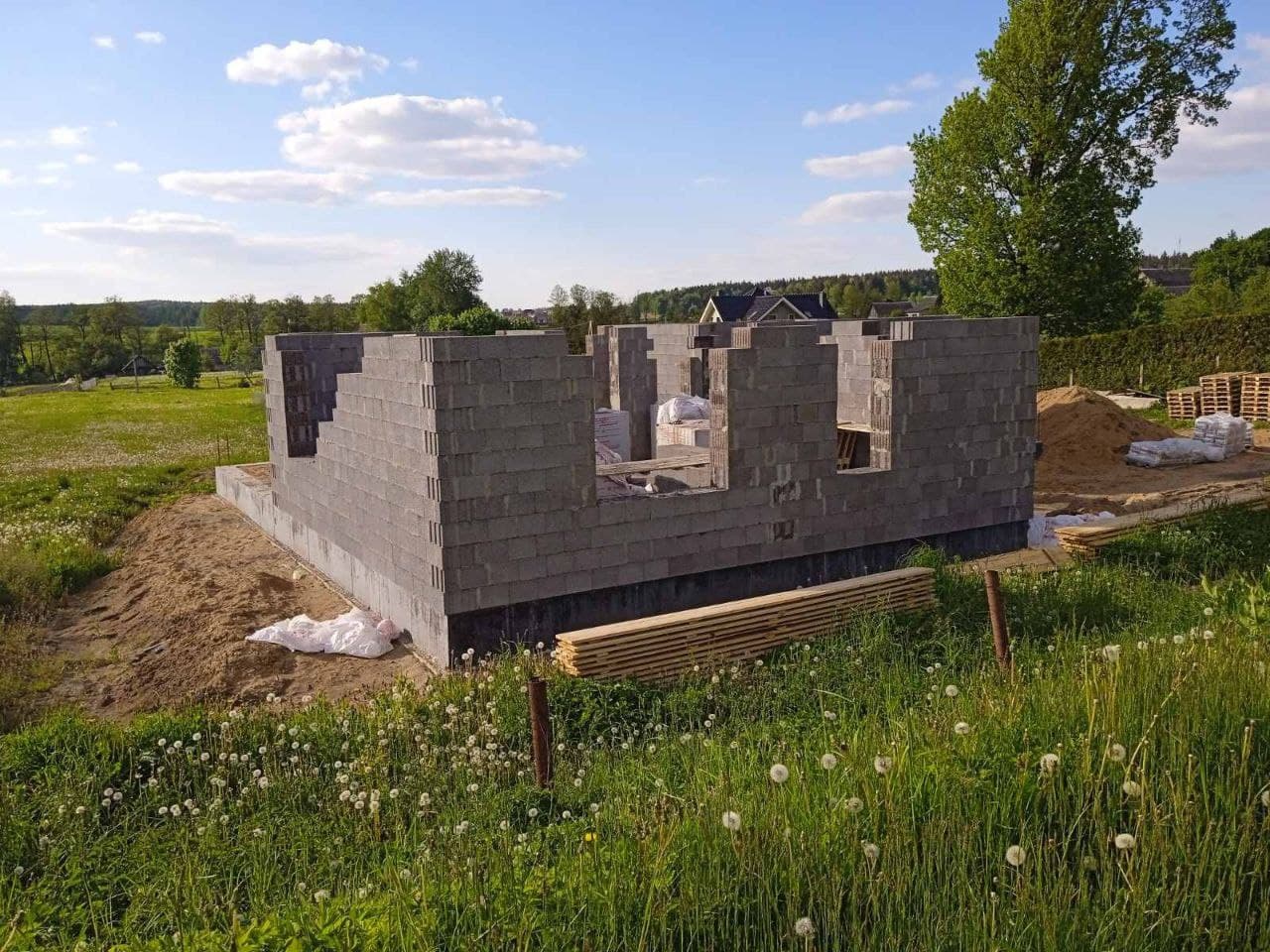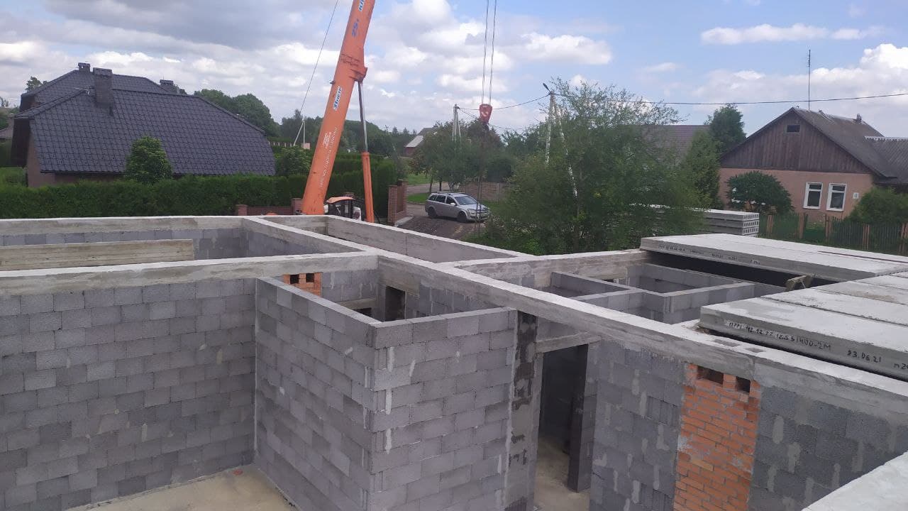 Стены из газобетонных блоков: Наружные – 400 мм. D400. Внутренние несущие – 250 мм. D500. Перегородки – 150 мм. D500. Армирование через каждые три ряда + подоконные зоны. Все бетонные элементы утеплены ЭППС + блок для исключения мостиков холода
