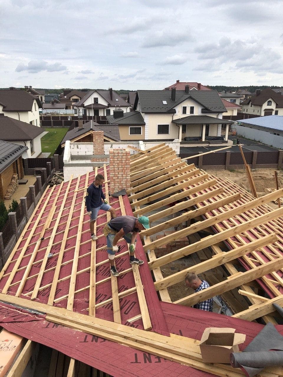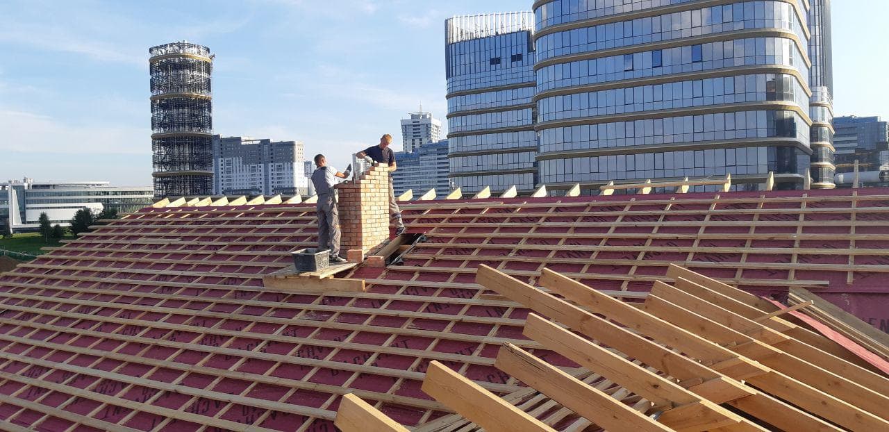 Стропильная система из сухой строганной доски 45х195мм. Кровля - Мягкая черепица по стропильной системе. Так же пирог кровли включает в себя гидроизоляцию из диффузионной мембраны Delta Neo Vent, утепление плитным базальтовым утеплителем Paroc eXtra 250 мм. и пароизоляцию Delta c проклейкой швов специальным скотчем.