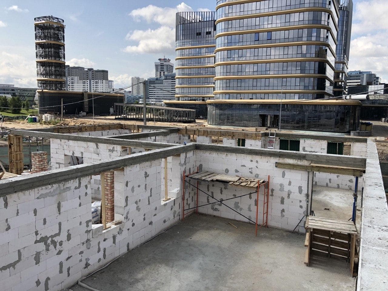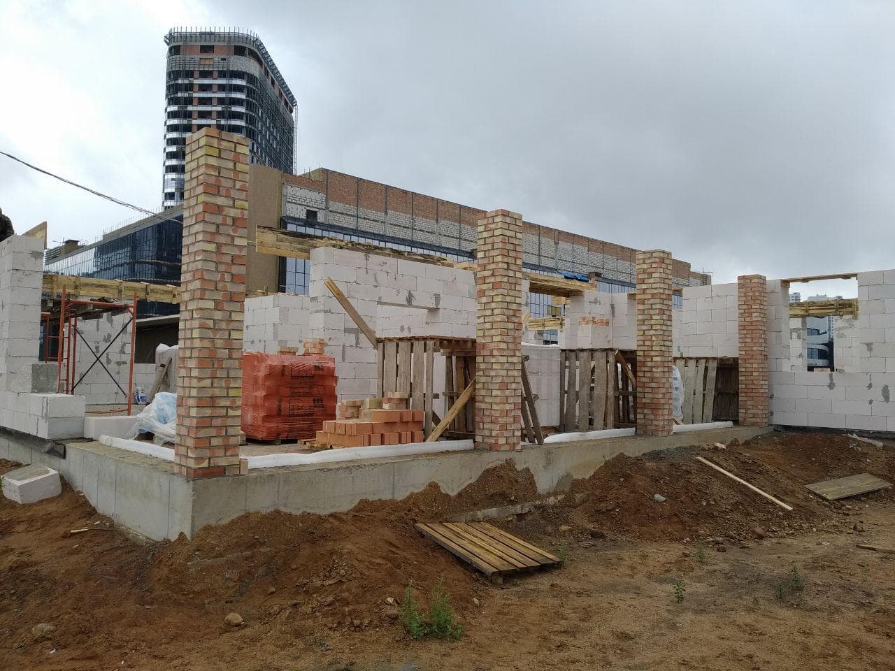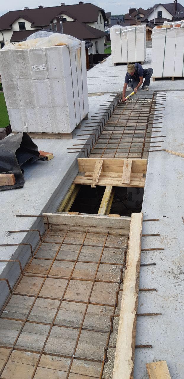 Стены из газобетонных блоков: Наружные – 400 мм. D400. Внутренние несущие – 250 мм. D500. Перегородки – 150 мм. D500. Армирование через каждые три ряда + подоконные зоны. Все бетонные элементы утеплены ЭППС + блок для исключения мостиков холода