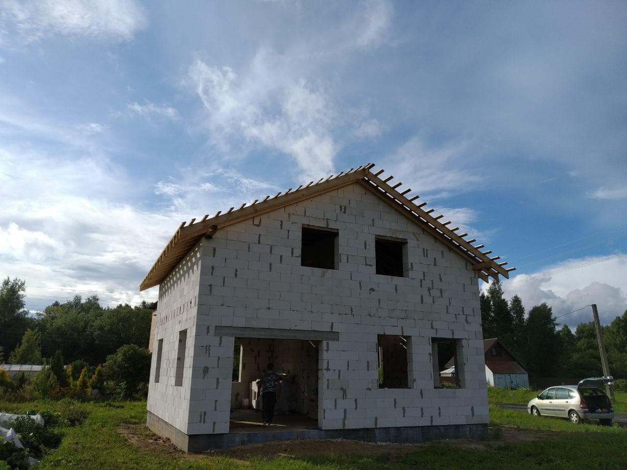 Стропильная система из сухой строганной доски 45х195мм. Кровля - Мягкая черепица по стропильной системе. Так же пирог кровли включает в себя гидроизоляцию из диффузионной мембраны Delta Neo Vent, утепление плитным базальтовым утеплителем Paroc eXtra 250 мм. и пароизоляцию Delta c проклейкой швов специальным скотчем.