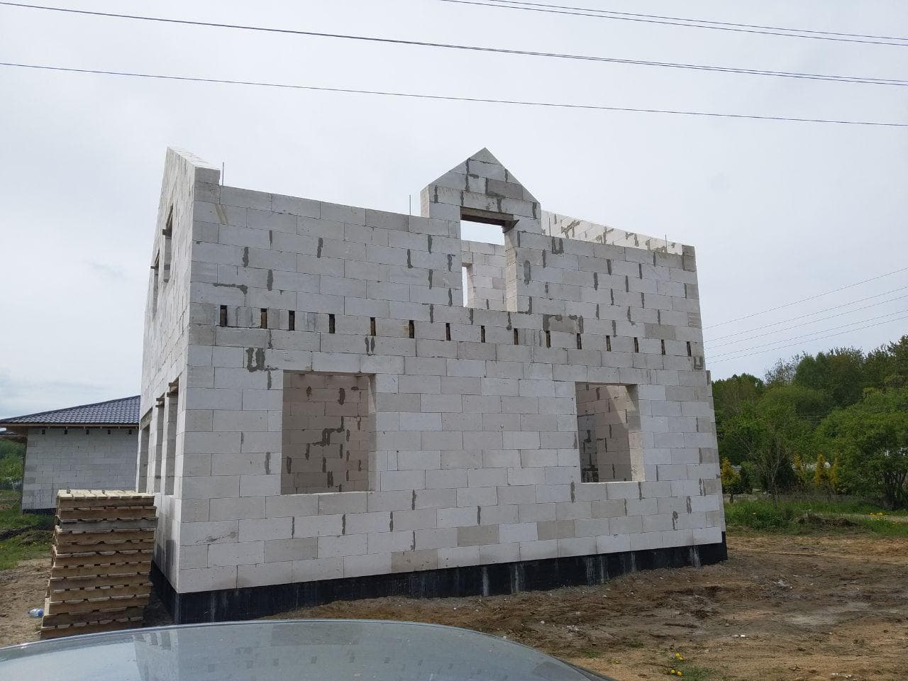 Стены из газобетонных блоков: Наружные – 400 мм. D400. Внутренние несущие – 250 мм. D500. Перегородки – 150 мм. D500. Армирование через каждые три ряда + подоконные зоны. Все бетонные элементы утеплены ЭППС + блок для исключения мостиков холода