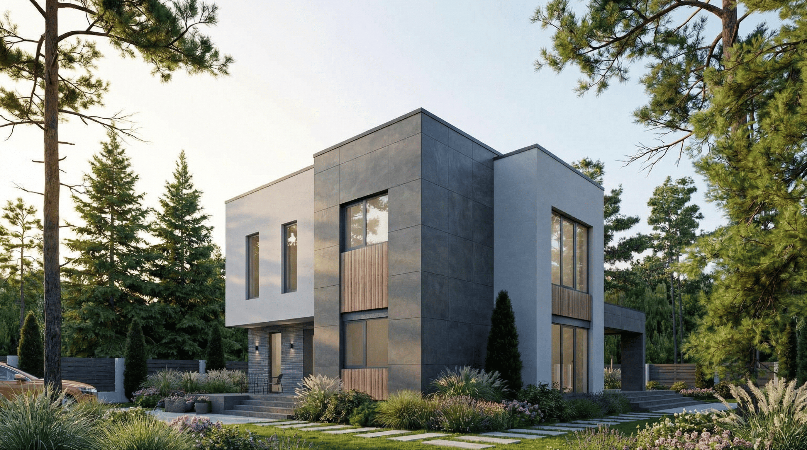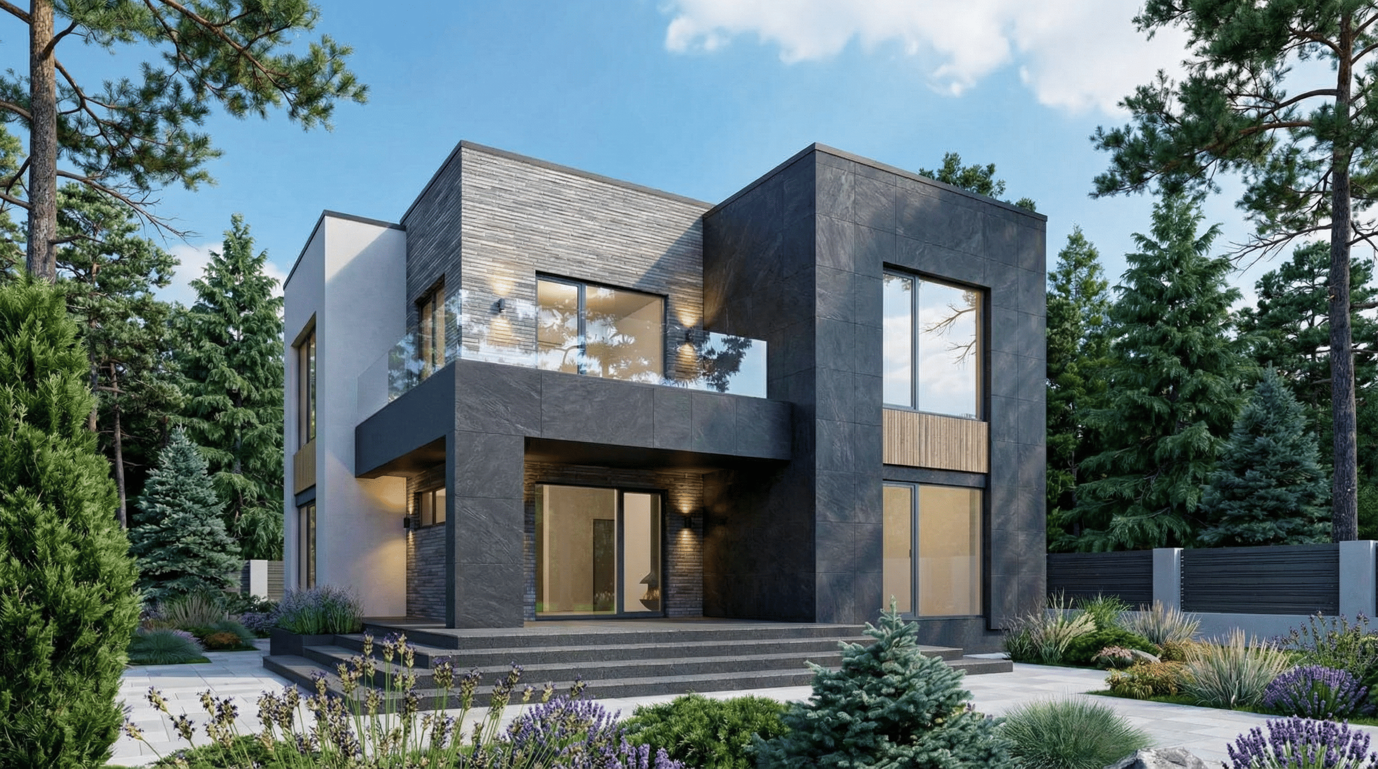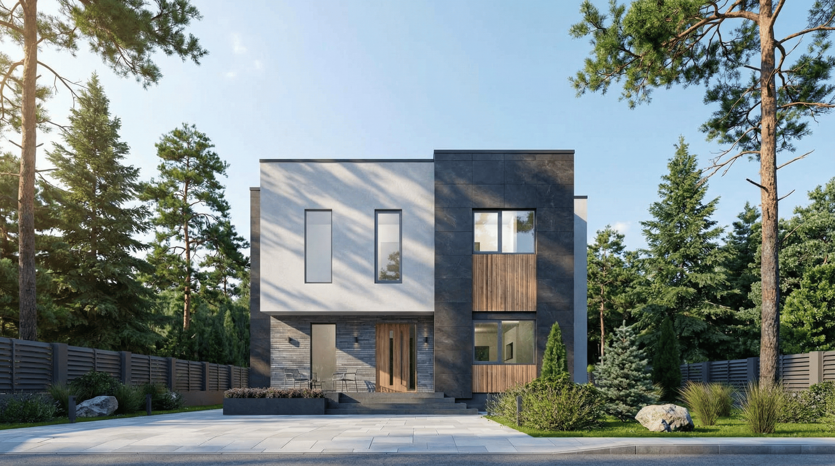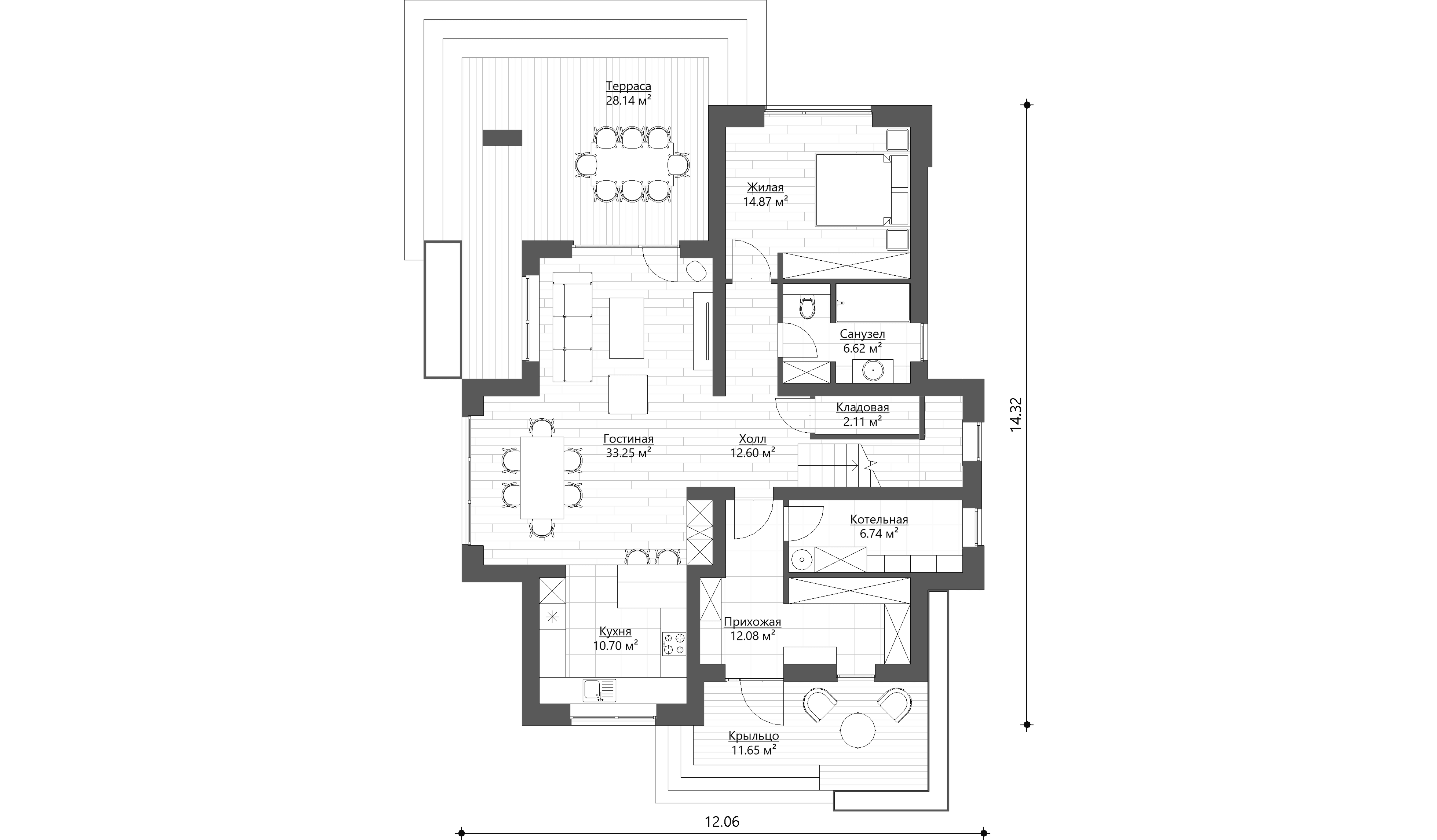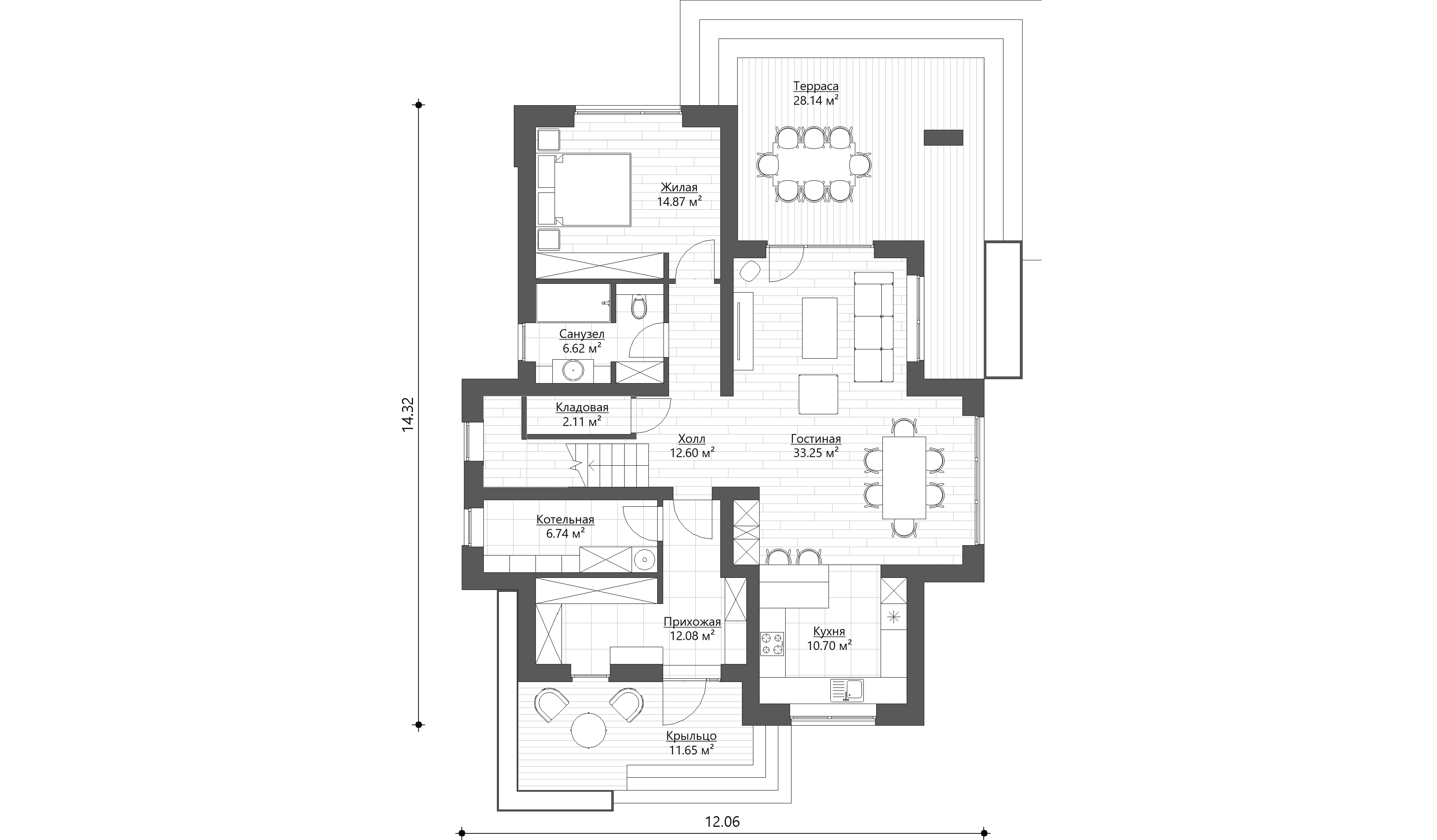 Современный дом со плоской кровлей. Компактный, уютный и эргономичный, имеющий все необходимое для комфортного круглогодичного или временного проживания. Помещения разделены на гостевую и спальную зоны. Широкие, комфортные крыльцо и терраса накрыты плоской кровлей. Из гостиной предусмотрен выход на просторную террасу. Проект имеет зеркальный вариант планировки, что позволяет разместить его на участке с любой ориентацией по сторонам света, а сдержанный современный стиль легко впишется в любую окружающую застройку.