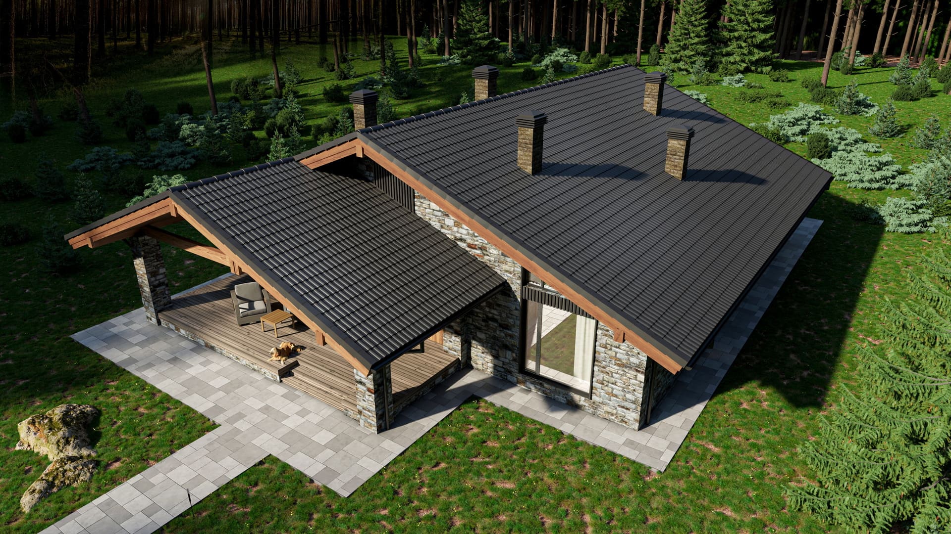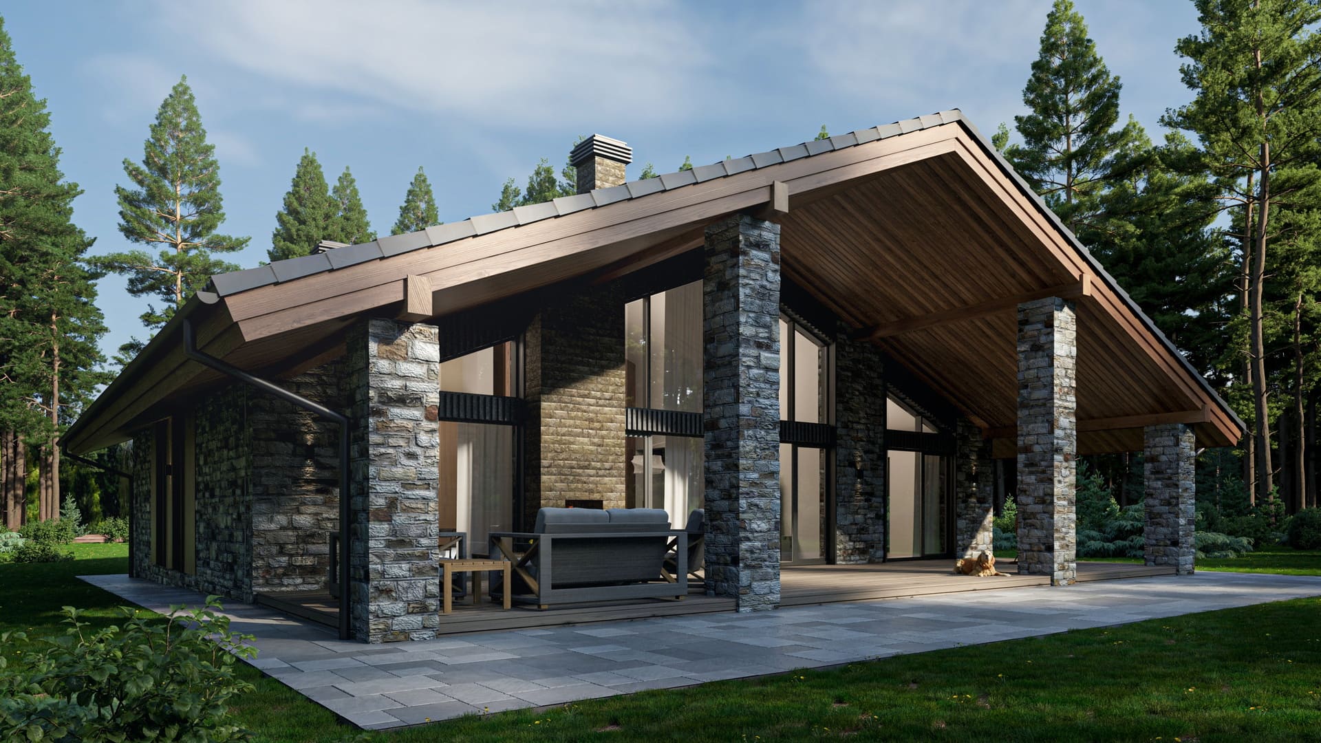 Уютное шале подходит для тихих уединенных участков, органично вписываясь в лесной массив с использованием природных материалов на фасадной отделке. Планировка дома рассчитана для комфортного проживания большой семьи.
