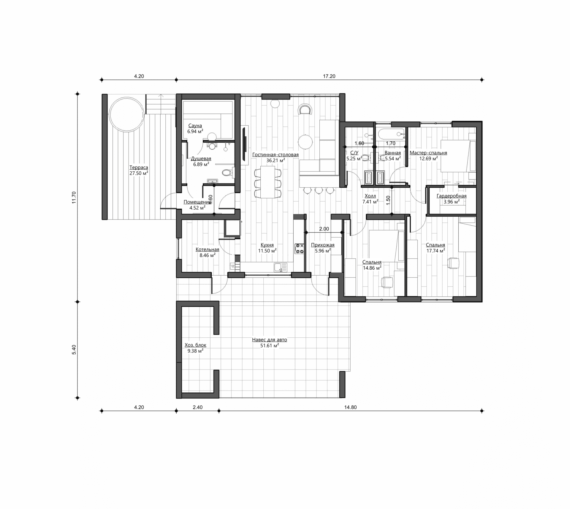 Вся инженерная инфраструктура сосредоточена в котельной, что обеспечивает простоту эксплуатации. Проект также предлагает зеркальный вариант планировки, позволяющий адаптировать дом под любой участок и его ориентацию относительно сторон света.