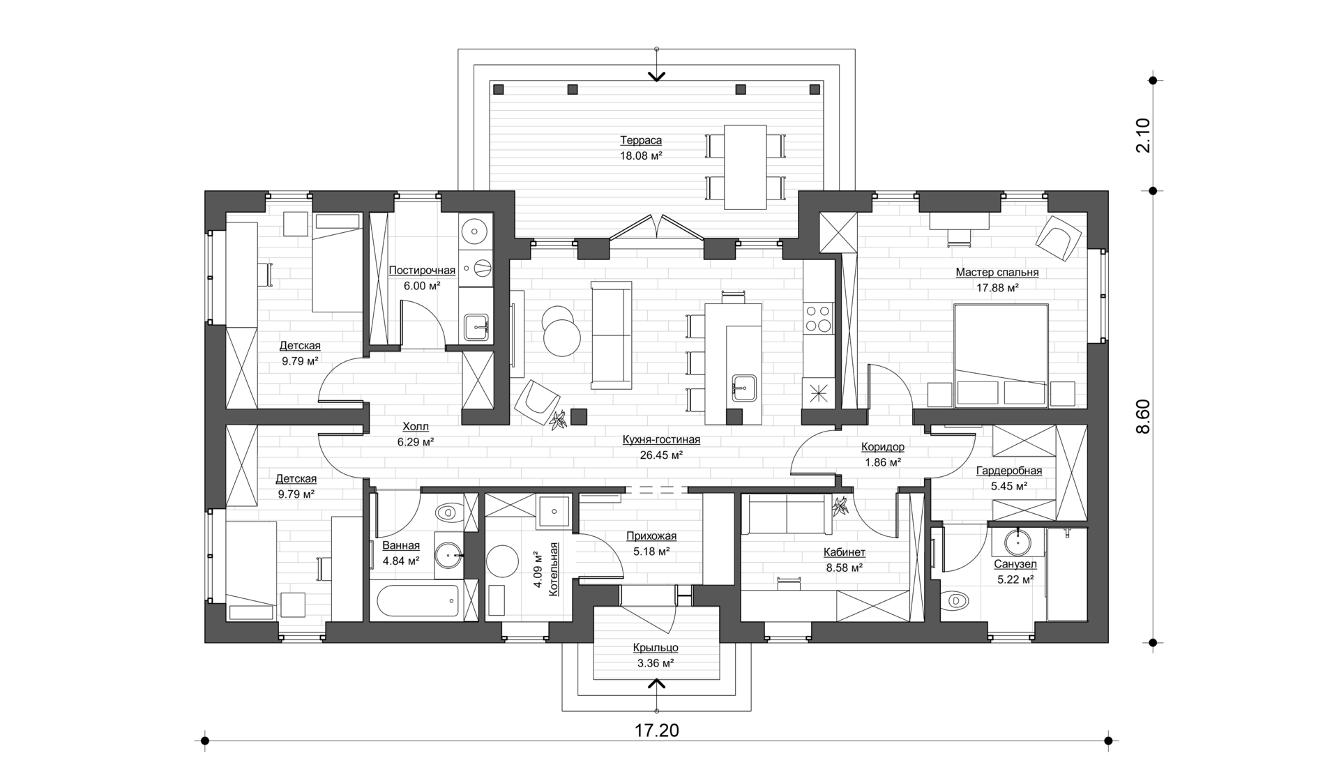 - Гостиная с открытой кухней и обеденной зоной: Просторная и светлая гостиная является центром дома, где приятно проводить время с семьей и друзьями. Открытая кухня, гармонично соединяется с обеденной зоной. Из гостиной есть выход на террасу, где можно наслаждаться свежим воздухом и отдыхать на природе.