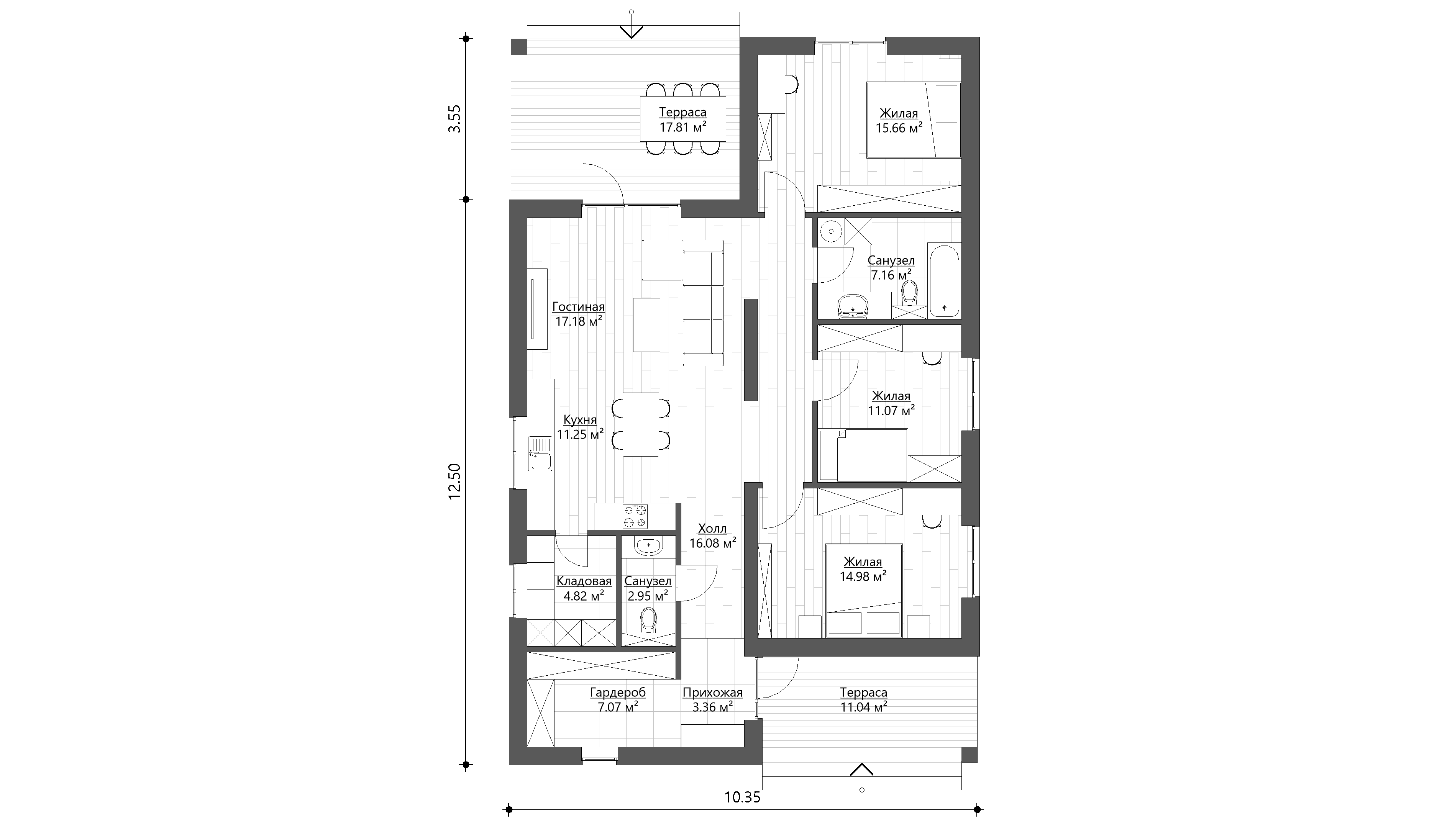 Данная серия проектов предполагает 8 планировочных решений от 63 до 134 м2 внутренней (отапливаемой) площади. Кухня-гостиная объединены в одно общее пространство, откуда можно выйти на просторную террасу.