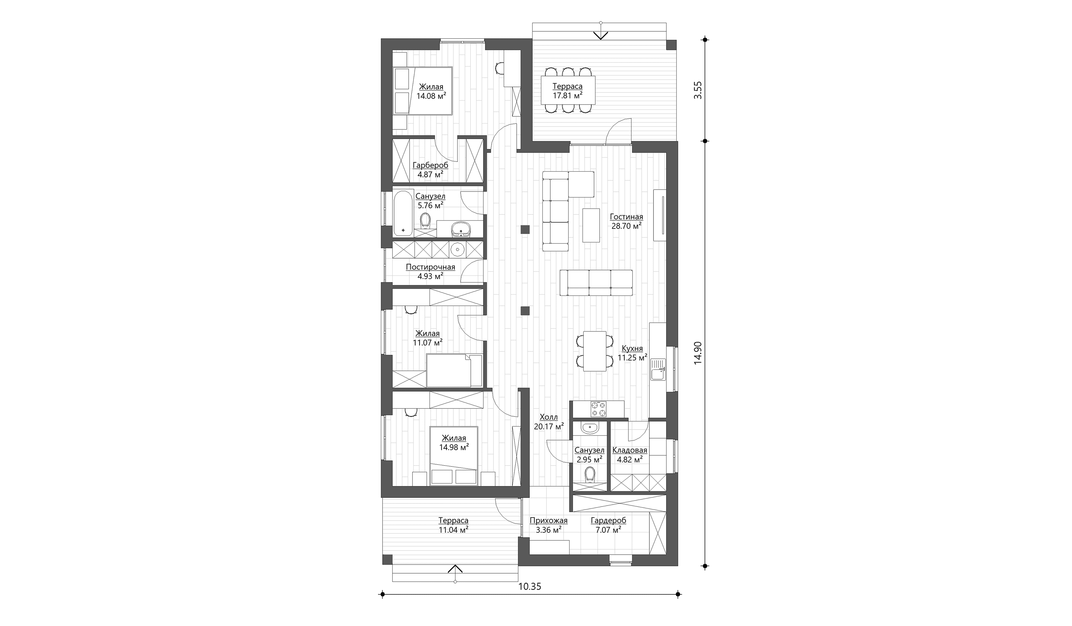 Данная серия проектов предполагает 8 планировочных решений от 63 до 134 м2 внутренней (отапливаемой) площади. Кухня-гостиная объединены в одно общее пространство, откуда можно выйти на просторную террасу.