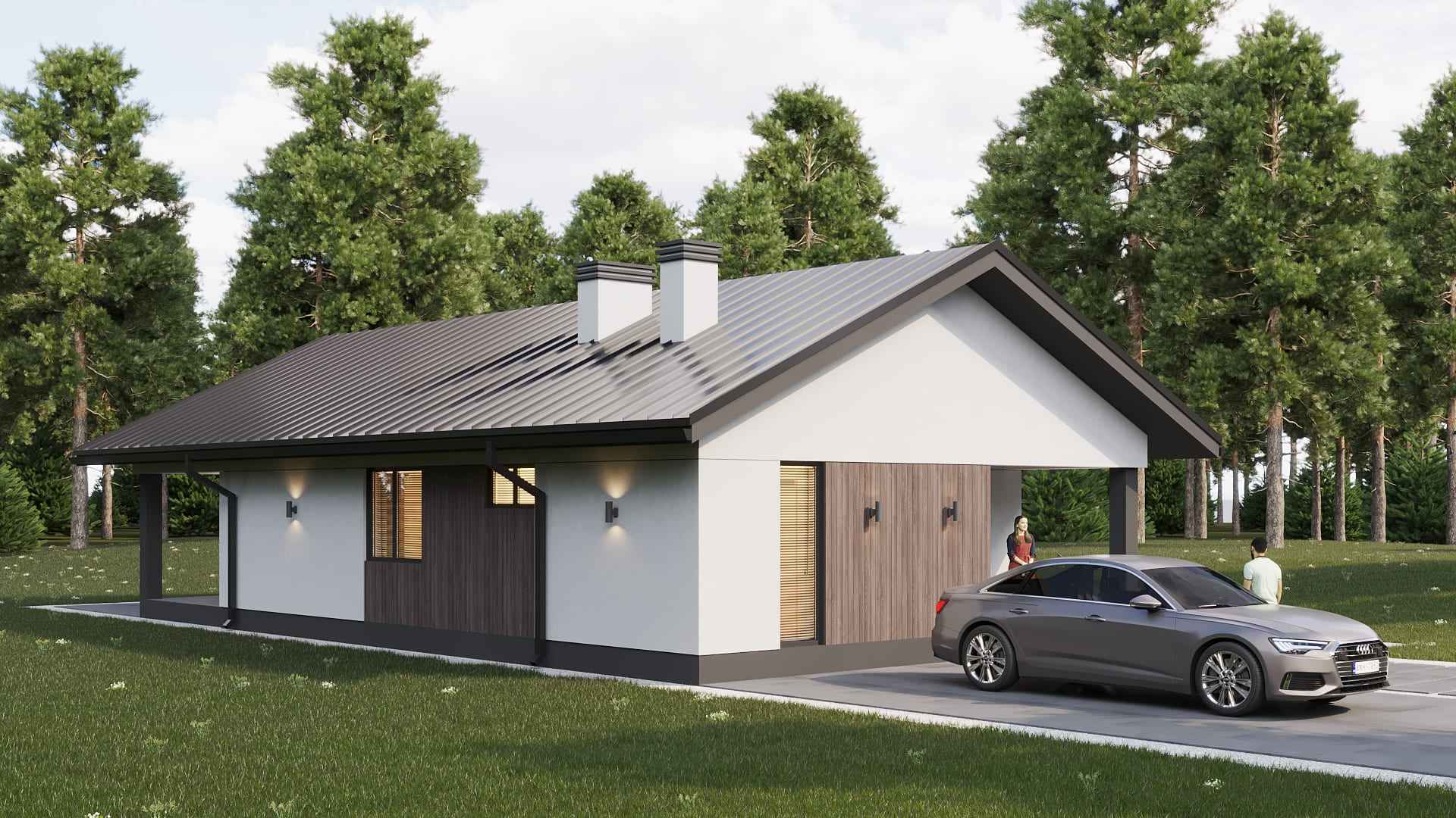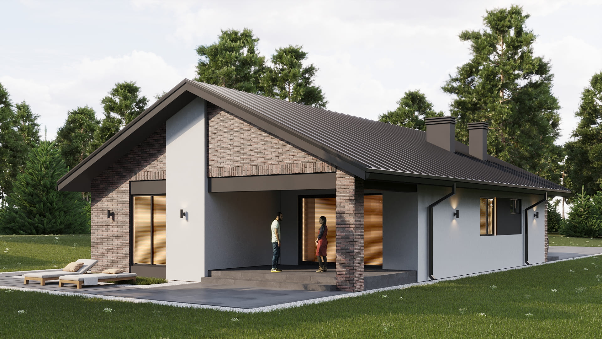 Уютный одноэтажный дом с классической и в тоже время простой двускатной кровлей. Имеет четкое и продуманное зонирование на общую (гостевую) и хозяйскую (спальную) зоны. Отлично подойдет для комфортного проживания и отдыха семьи из 3-5 человек.