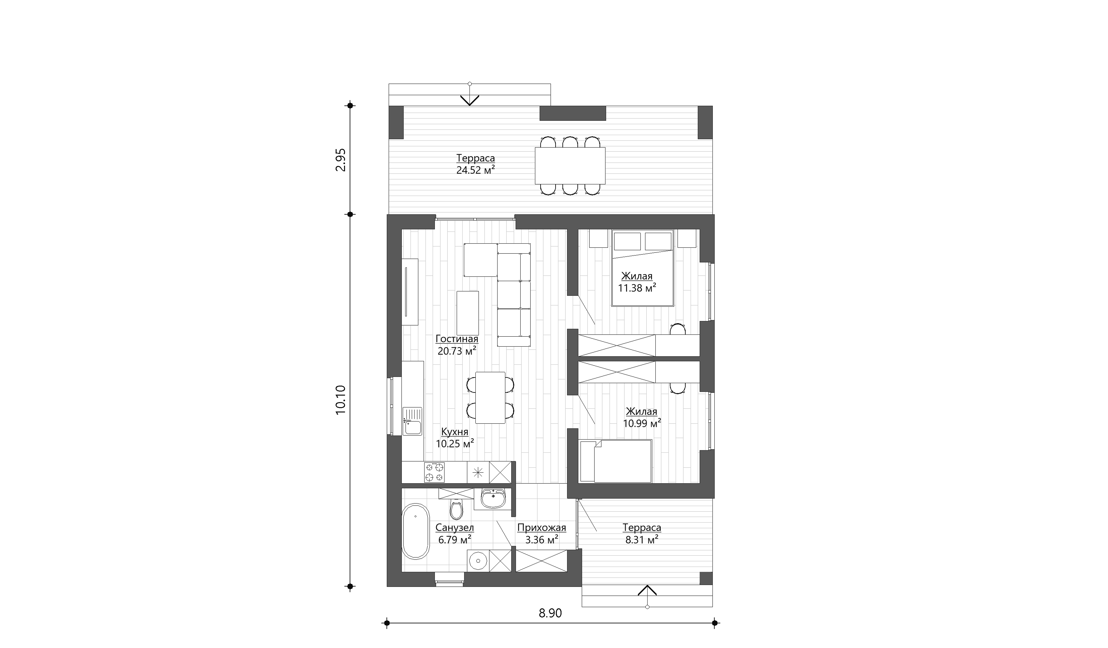 Данная серия проектов предполагает 8 планировочных решений от 63 до 134 м2 внутренней (отапливаемой) площади. Кухня-гостиная объединены в одно общее пространство, откуда можно выйти на просторную террасу.