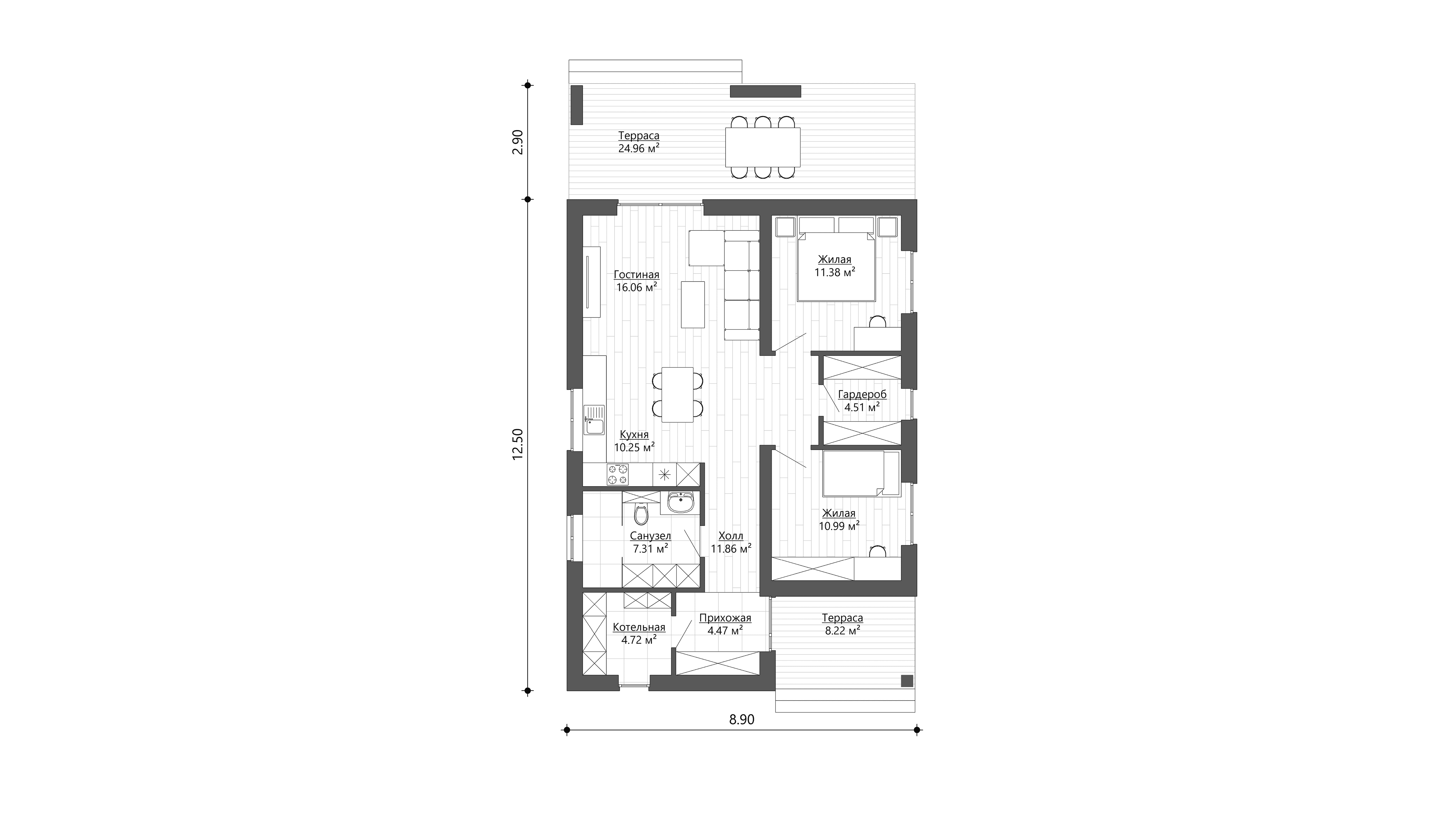 Данная серия проектов предполагает 8 планировочных решений от 63 до 134 м2 внутренней (отапливаемой) площади. Кухня-гостиная объединены в одно общее пространство, откуда можно выйти на просторную террасу.