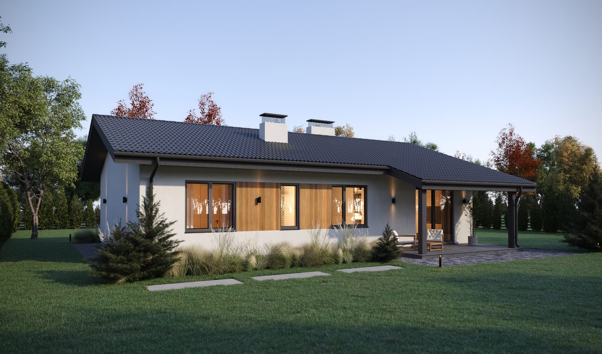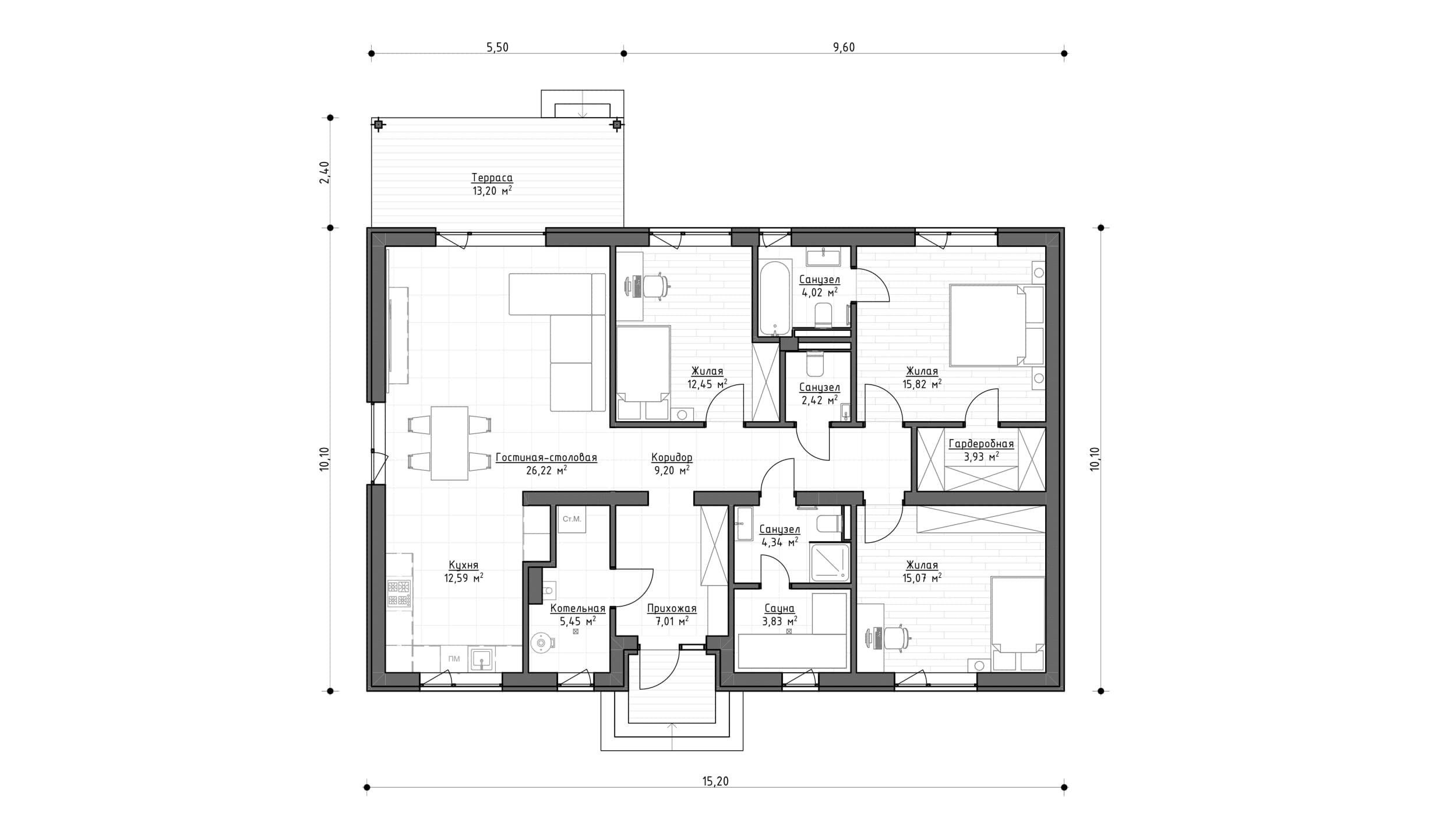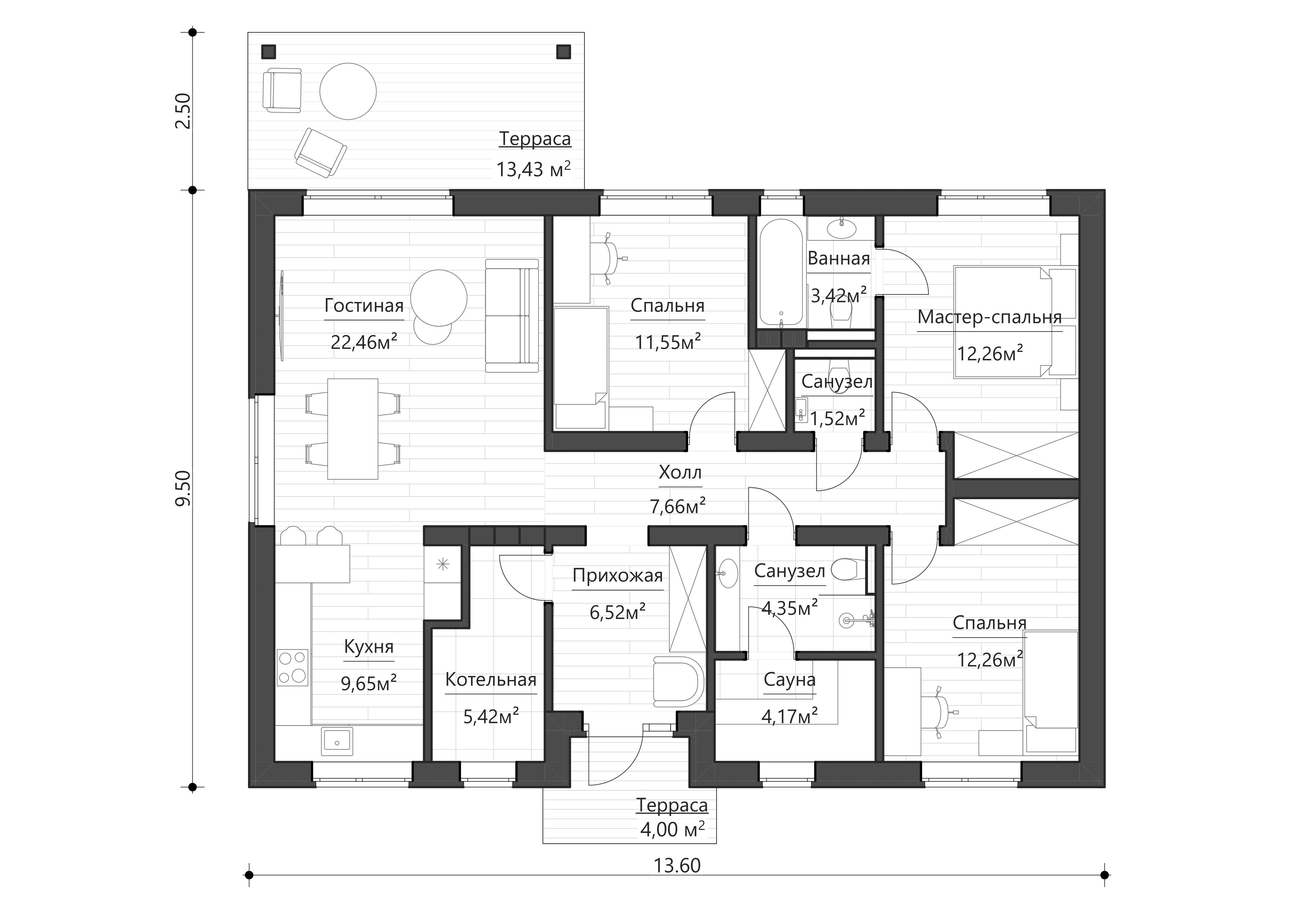 Дом разделен на две функциональные зоны: с левой стороны от входа находится просторная кухня-гостиная с выходом на террасу, справа - спальни, в которых предусмотрены места для работы и учебы, а также встроенные шкафы для хранения вещей.