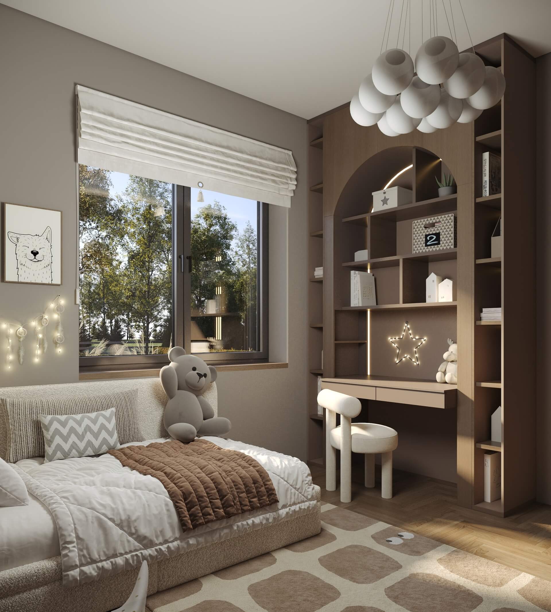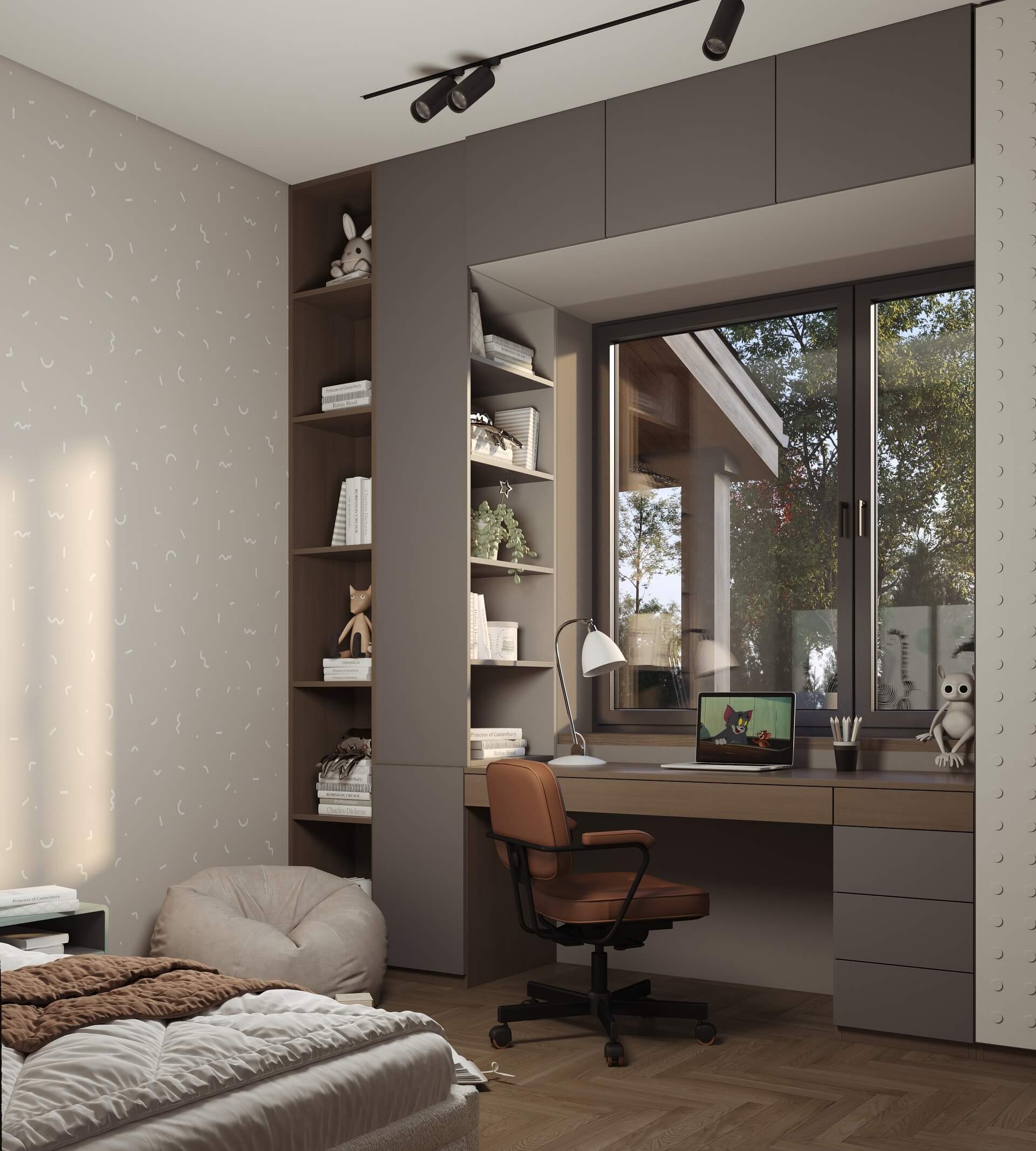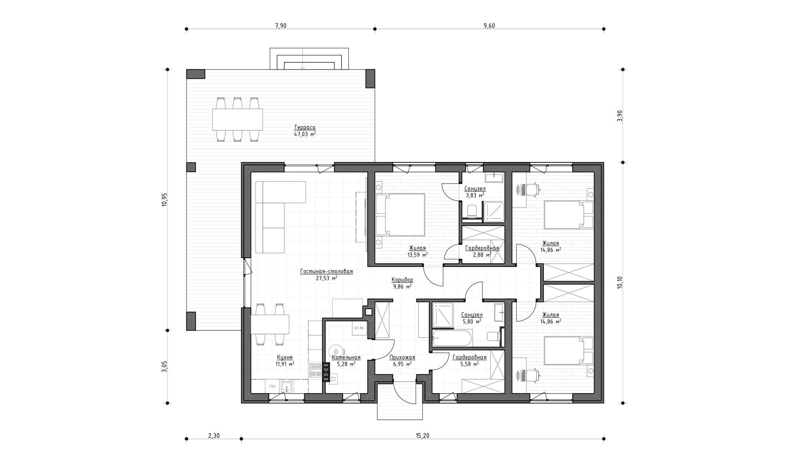 Дом разделен на две функциональные зоны: с левой стороны от входа находится просторная кухня-гостиная с выходом на террасу, справа - спальни, в которых предусмотрены места для работы и учебы, а также встроенные шкафы для хранения вещей.