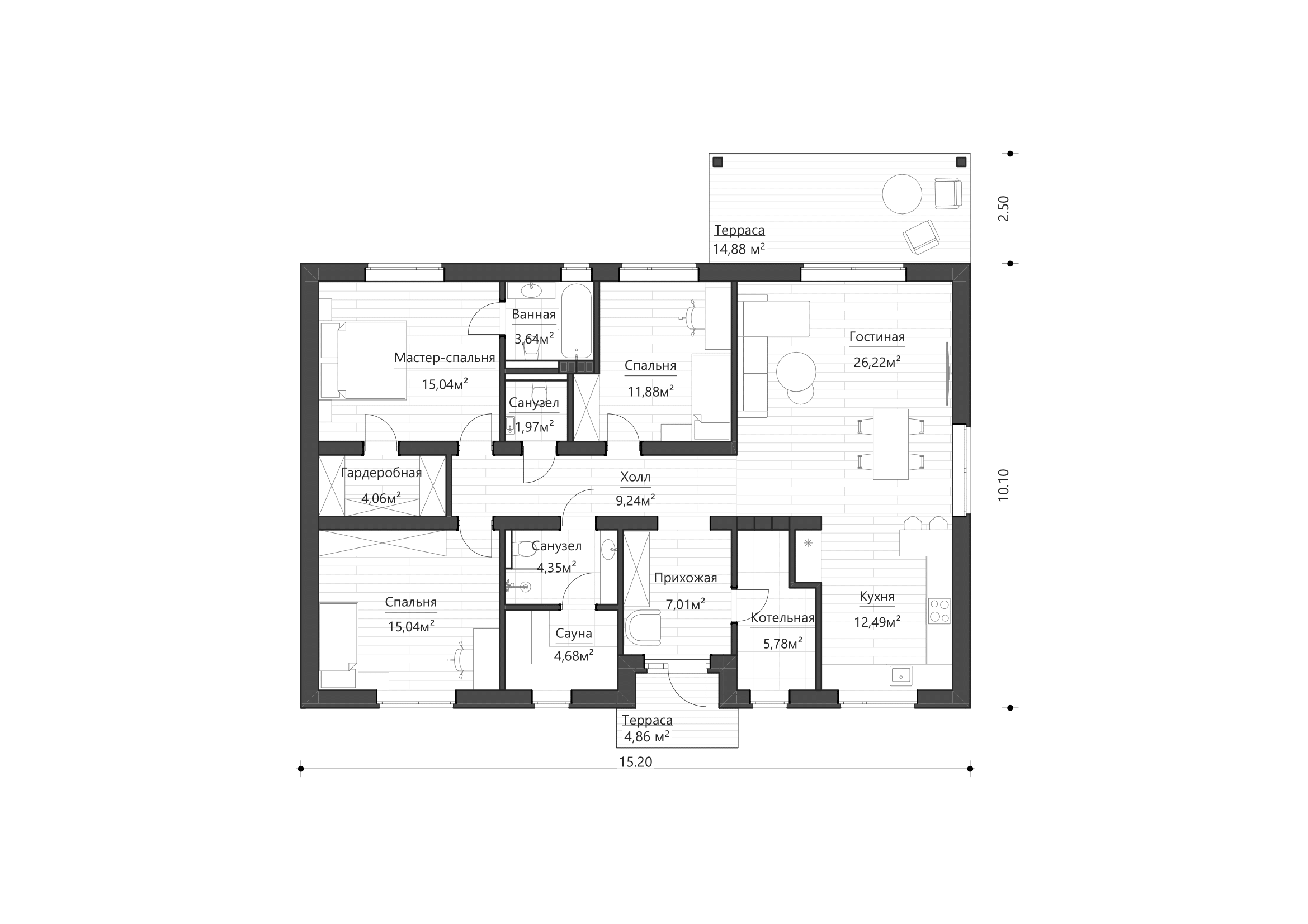 Дом разделен на две функциональные зоны: с левой стороны от входа находится просторная кухня-гостиная с выходом на террасу, справа - спальни, в которых предусмотрены места для работы и учебы, а также встроенные шкафы для хранения вещей.