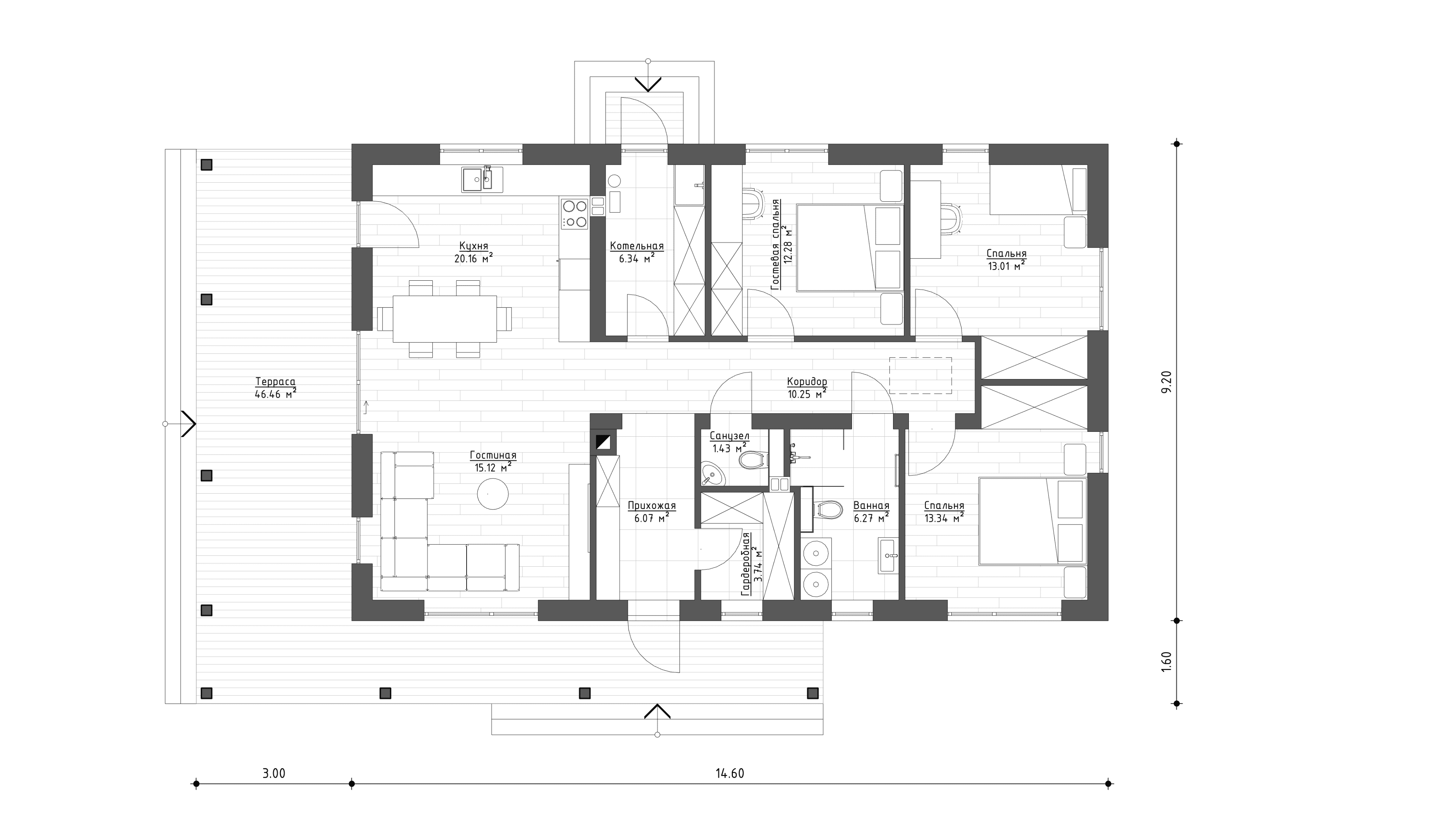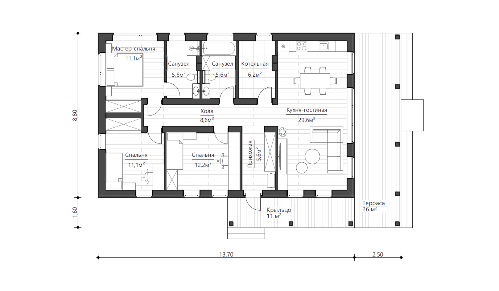 Дом разделен на две функциональные зоны: с левой стороны от входа находится просторная кухня-гостиная с выходом на террасу, справа - спальни, в которых предусмотрены места для работы и учебы, а также встроенные шкафы для хранения вещей. В доме располагается мини-гардеробная, несколько санузлов и котельная с достаточной площадью для расположения всего необходимого оборудования. Просторная кухня-гостиная с возможностью предусмотреть камин и крытая терраса позволит провести множество прекрасных вечеров в компании близких вам людей.