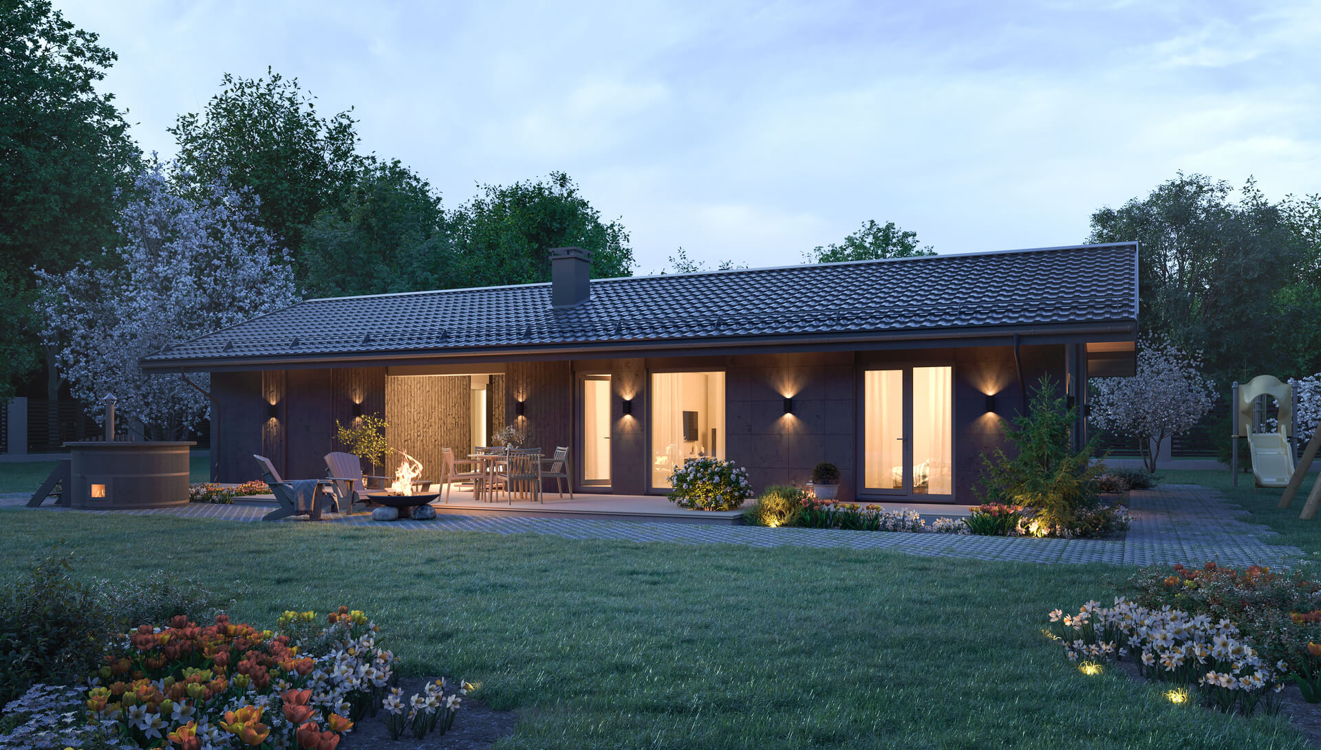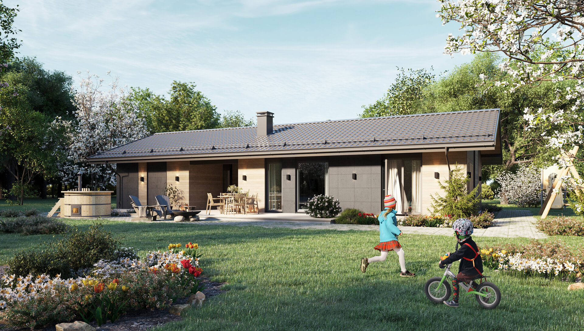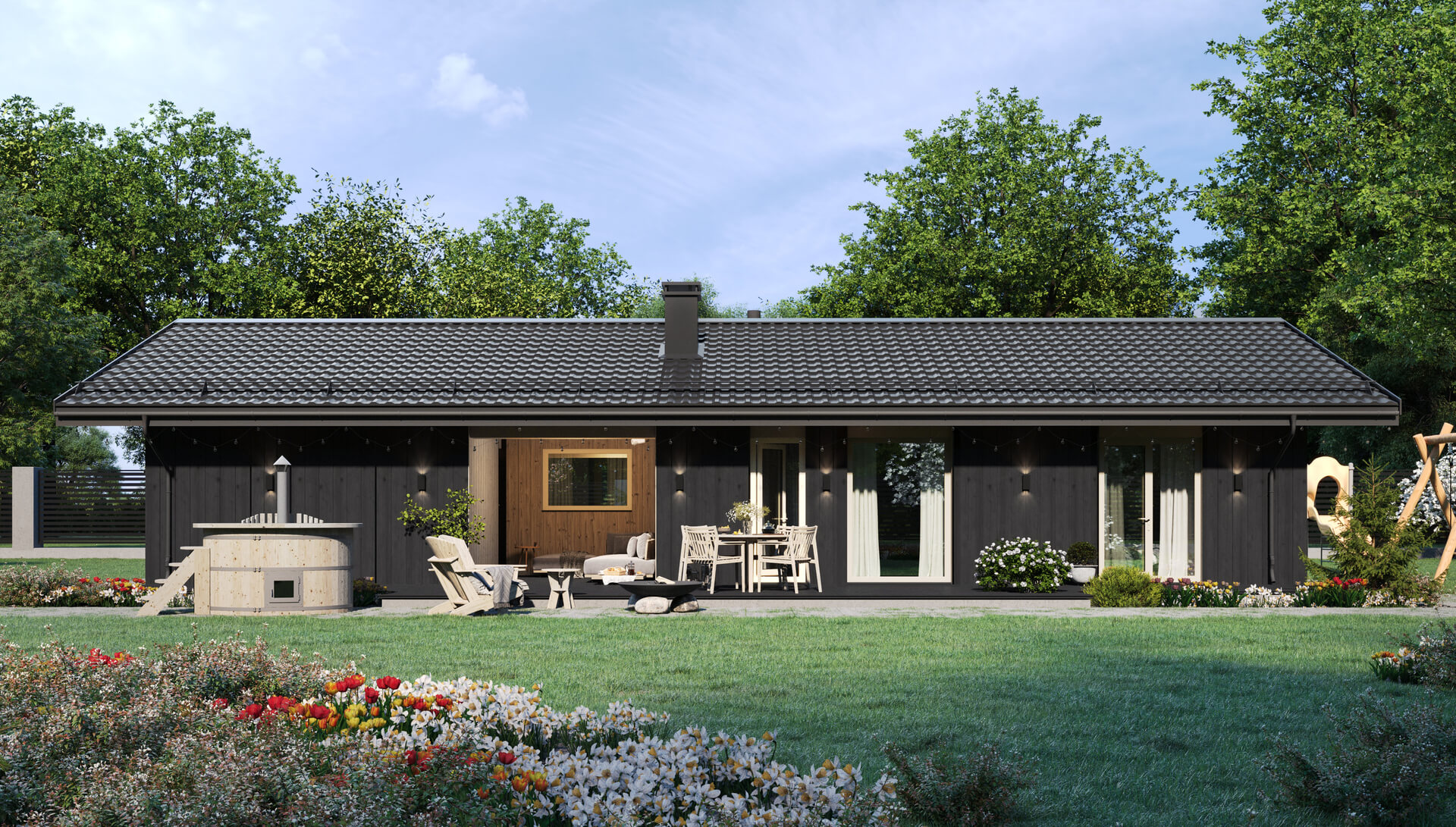Панорамное остекление с возможностью выхода на террасу прямо из спальни позволит наслаждаться утренней природой с чашечкой горячего напитка в руках.