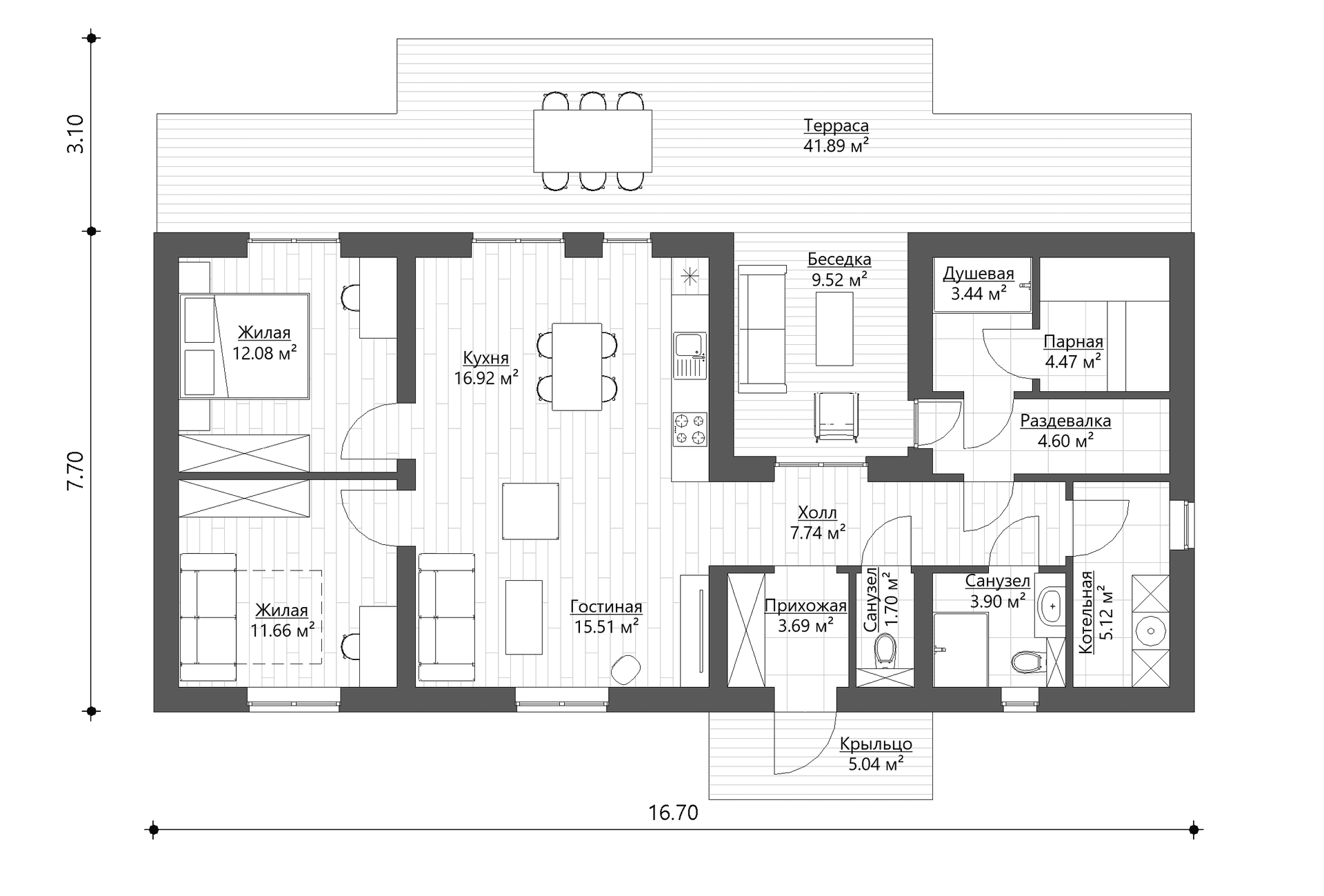 Планировка дома может быть выполнены в различных вариантах, например с двумя спальнями, СПА зоной и беседкой, или вместо СПА появляется третья спальня. Есть также варианты без беседки с тремя спальнями и СПА зоной или с мастер-спальней.