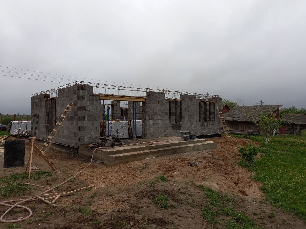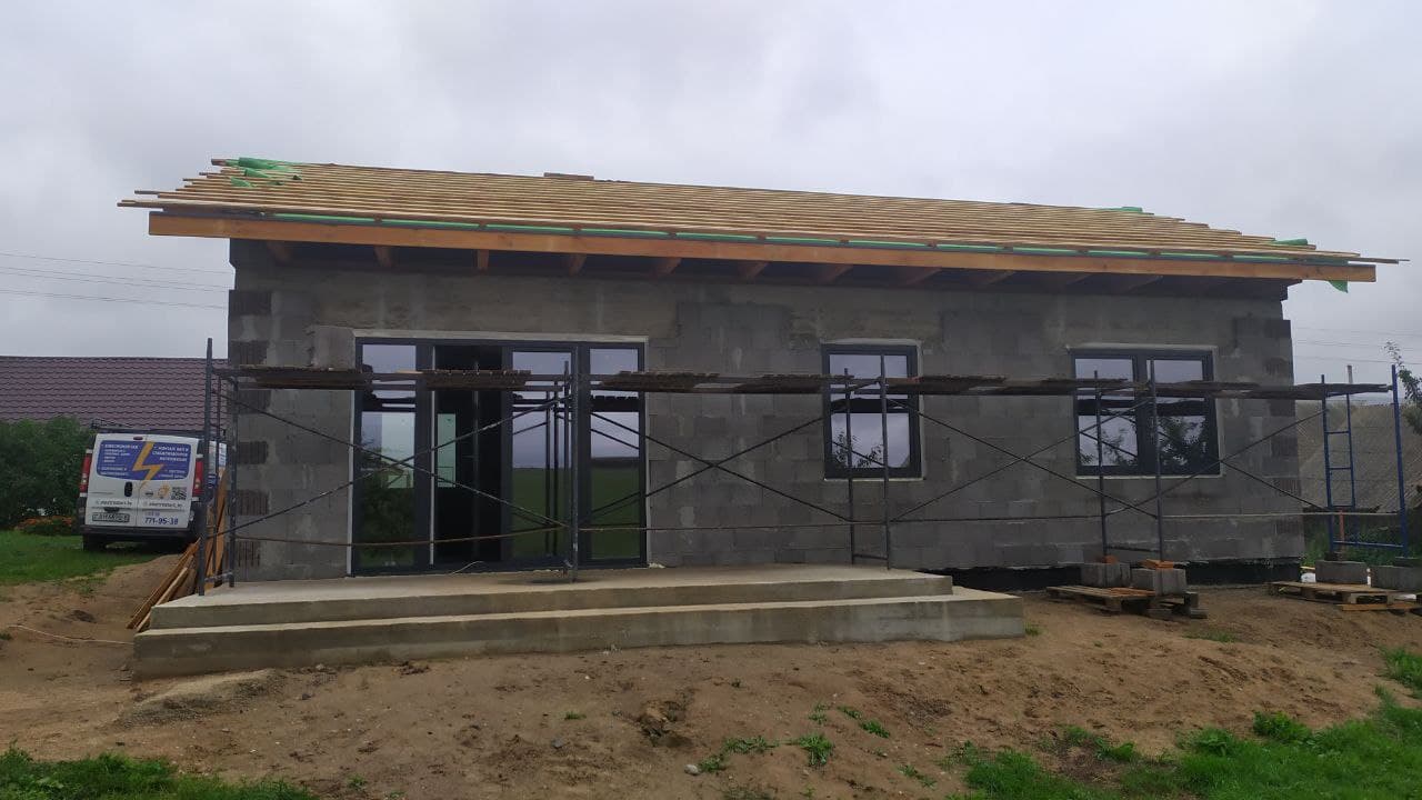 Стены из газобетонных блоков: Наружные – 400 мм. D400. Внутренние несущие – 250 мм. D500. Перегородки – 150 мм. D500. Армирование через каждые три ряда + подоконные зоны. Все бетонные элементы утеплены ЭППС + блок для исключения мостиков холода