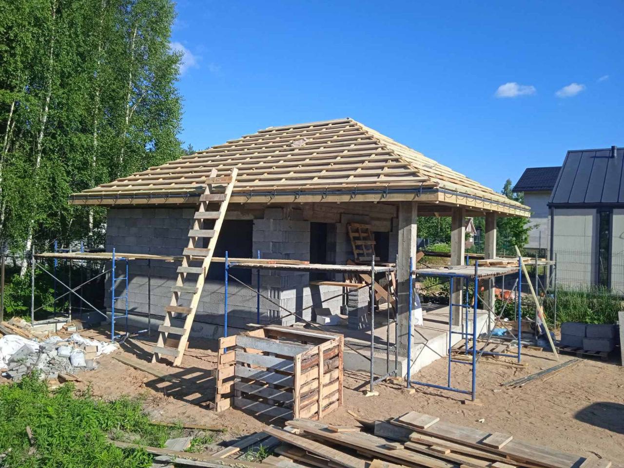 Стропильная система из сухой строганной доски 45х195мм. Кровля - Мягкая черепица по стропильной системе. Так же пирог кровли включает в себя гидроизоляцию из диффузионной мембраны Delta Neo Vent, утепление плитным базальтовым утеплителем Paroc eXtra 250 мм. и пароизоляцию Delta c проклейкой швов специальным скотчем.