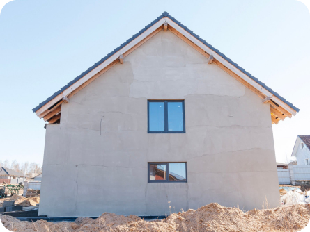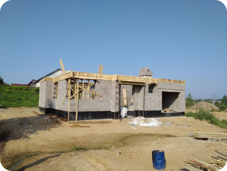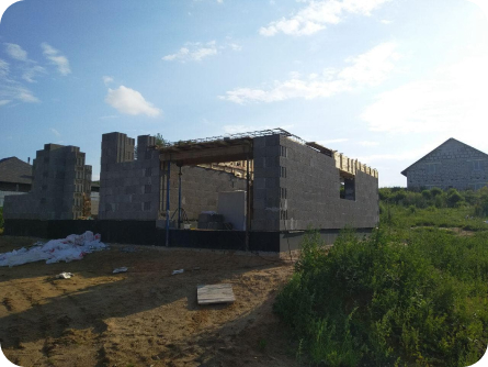 Стены из газобетонных блоков: Наружные – 400 мм. D400. Внутренние несущие – 250 мм. D500. Перегородки – 150 мм. D500. Армирование через каждые три ряда + подоконные зоны. Все бетонные элементы утеплены ЭППС + блок для исключения мостиков холода