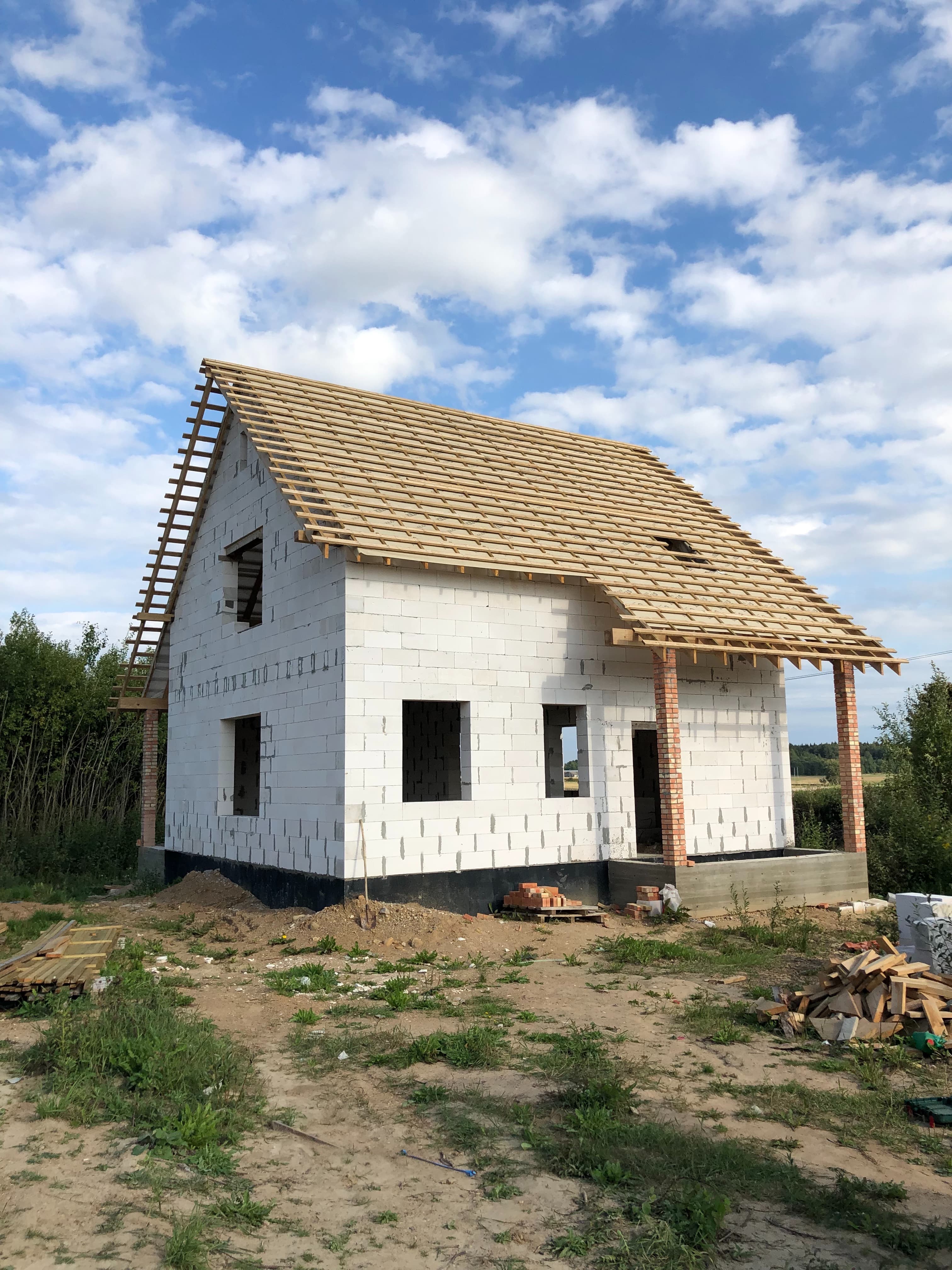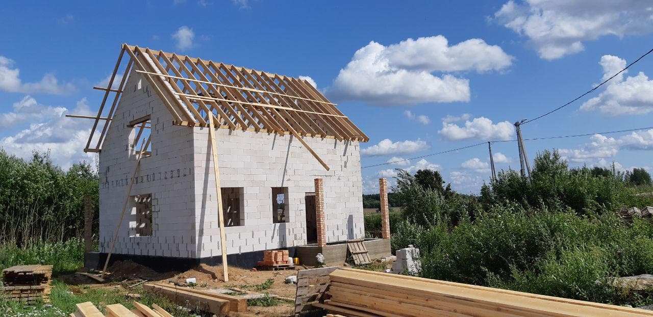 Стропильная система из сухой строганной доски 45х195мм. Кровля - Мягкая черепица по стропильной системе. Так же пирог кровли включает в себя гидроизоляцию из диффузионной мембраны Delta Neo Vent, утепление плитным базальтовым утеплителем Paroc eXtra 250 мм. и пароизоляцию Delta c проклейкой швов специальным скотчем.
