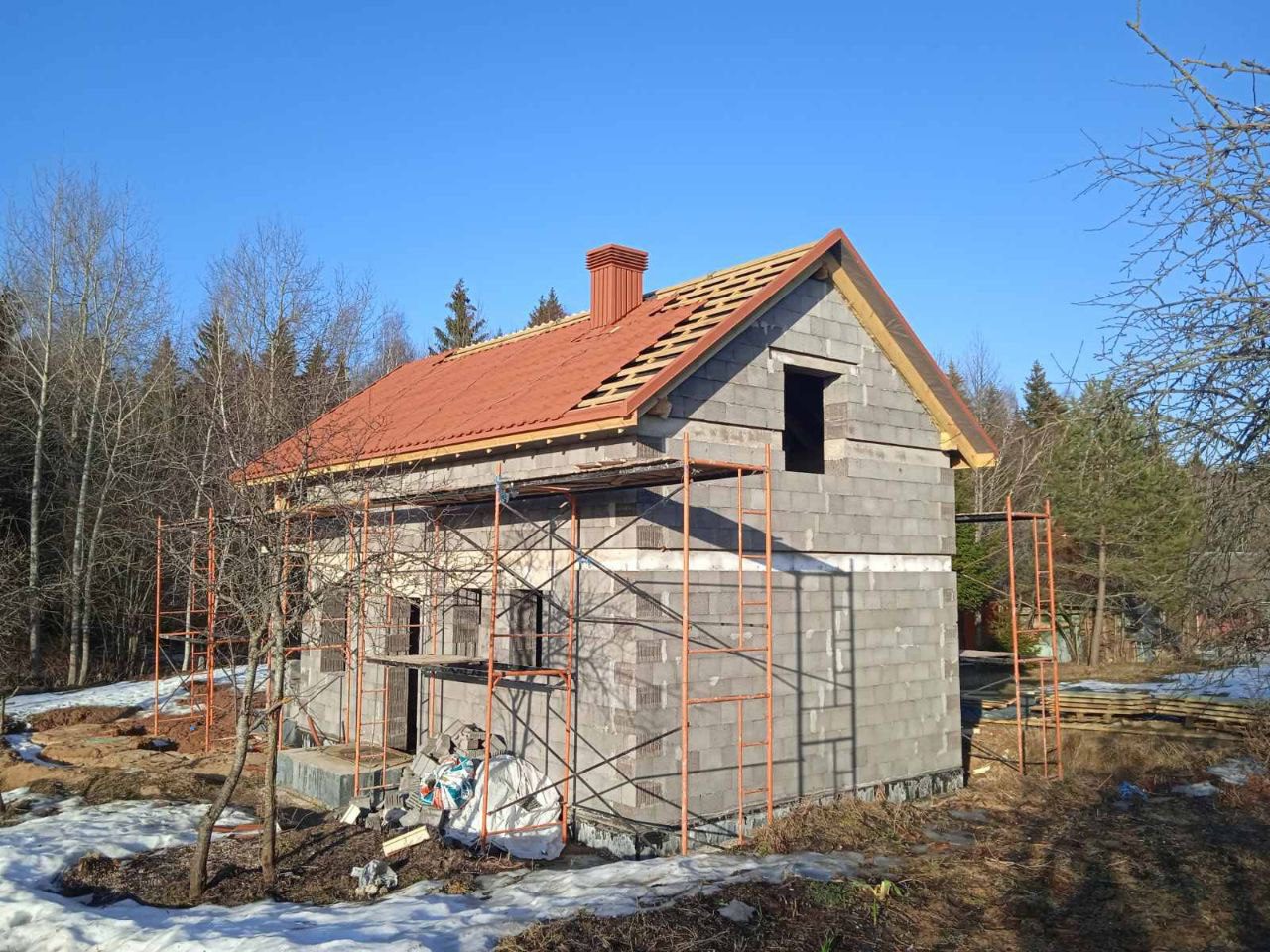 Стропильная система из сухой строганной доски 45х195мм. Кровля - Мягкая черепица по стропильной системе. Так же пирог кровли включает в себя гидроизоляцию из диффузионной мембраны Delta Neo Vent, утепление плитным базальтовым утеплителем Paroc eXtra 250 мм. и пароизоляцию Delta c проклейкой швов специальным скотчем.