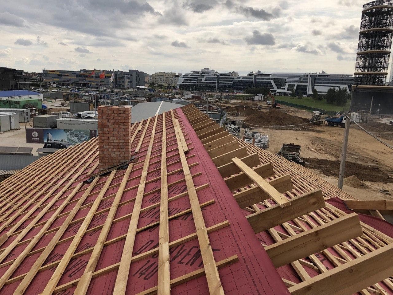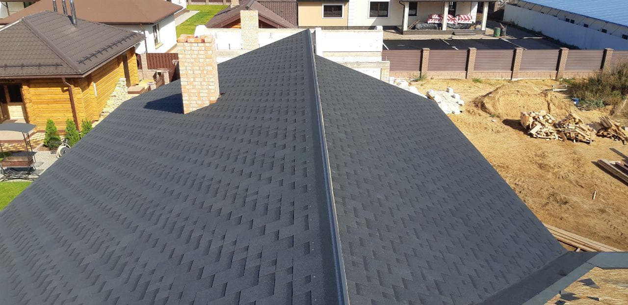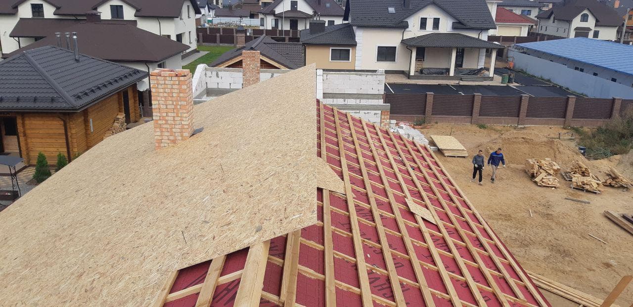 Стропильная система из сухой строганной доски 45х195мм. Кровля - Мягкая черепица по стропильной системе. Так же пирог кровли включает в себя гидроизоляцию из диффузионной мембраны Delta Neo Vent, утепление плитным базальтовым утеплителем Paroc eXtra 250 мм. и пароизоляцию Delta c проклейкой швов специальным скотчем.