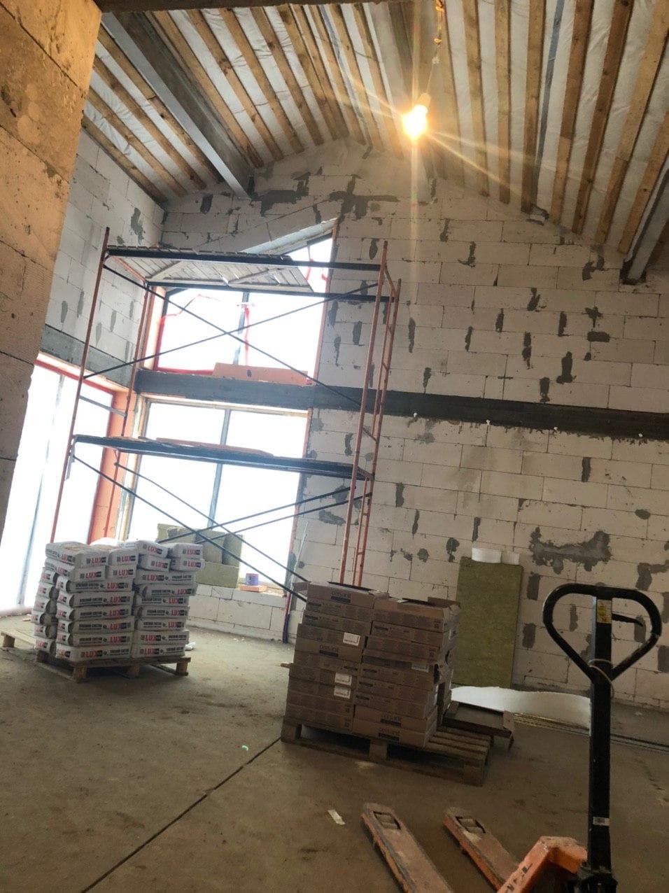 Стены из газобетонных блоков: Наружные – 400 мм. D400. Внутренние несущие – 250 мм. D500. Перегородки – 150 мм. D500. Армирование через каждые три ряда + подоконные зоны. Все бетонные элементы утеплены ЭППС + блок для исключения мостиков холода