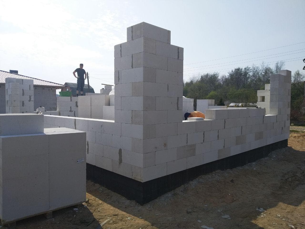 Стены из газобетонных блоков: Наружные – 400 мм. D400. Внутренние несущие – 250 мм. D500. Перегородки – 150 мм. D500. Армирование через каждые три ряда + подоконные зоны. Все бетонные элементы утеплены ЭППС + блок для исключения мостиков холода